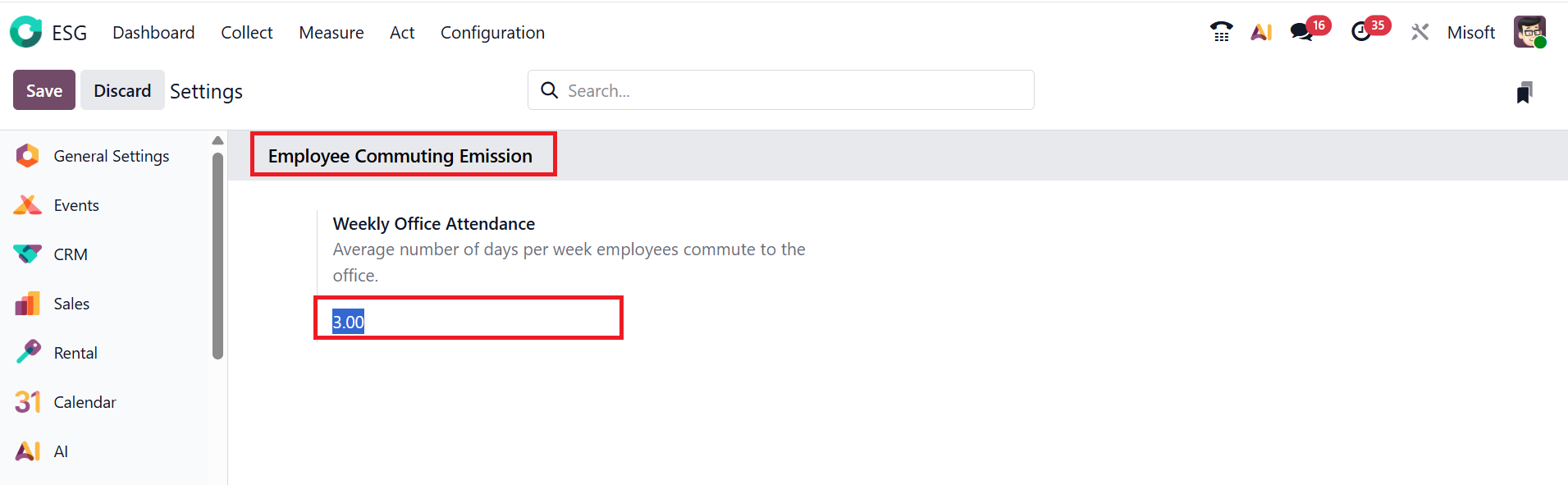 In the Odoo 19 ESG module Settings option, you can add the average number of days per week that employees attend and work at the office under the Weekly Office Attendance option. This option allows you to calculate employee commuting emissions, because the more days employees come to the office, the more transportation emissions are created.