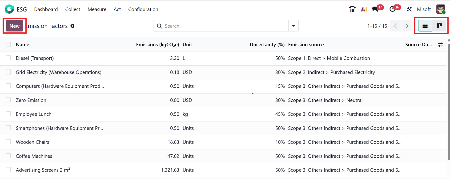 In the Odoo 19 ESG module, Emission Factors are the values that the system uses to calculate the amount of carbon produced from each type of activity. Here, you can view the details of the emission factors, such as Name, Emissions (kgCO2e), Unit, Emission Sources, and Source Database. You can view the emission factors in the List and Kanban views. To create a new emission factor, click on the New button.