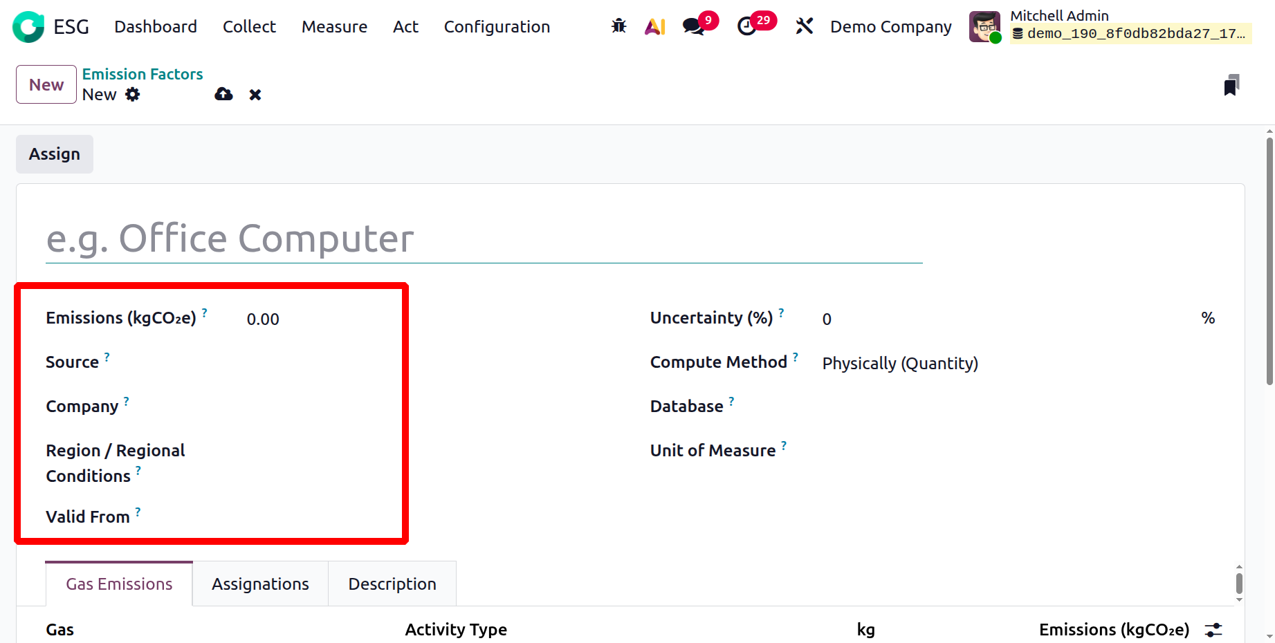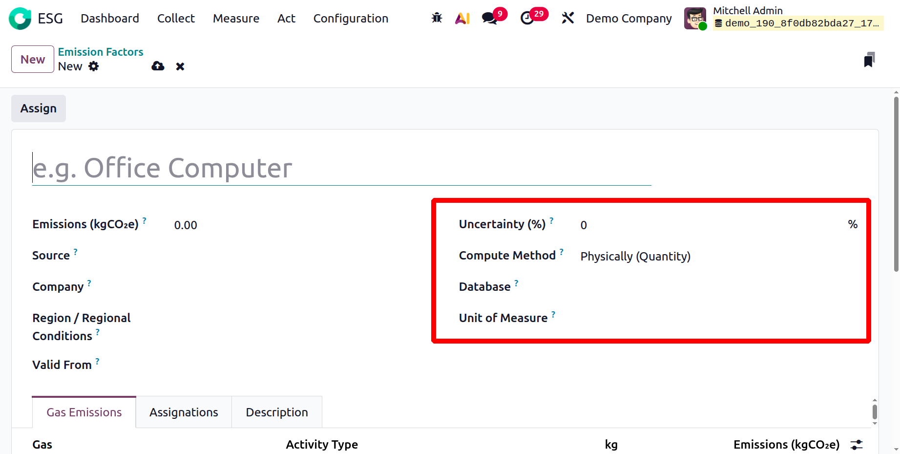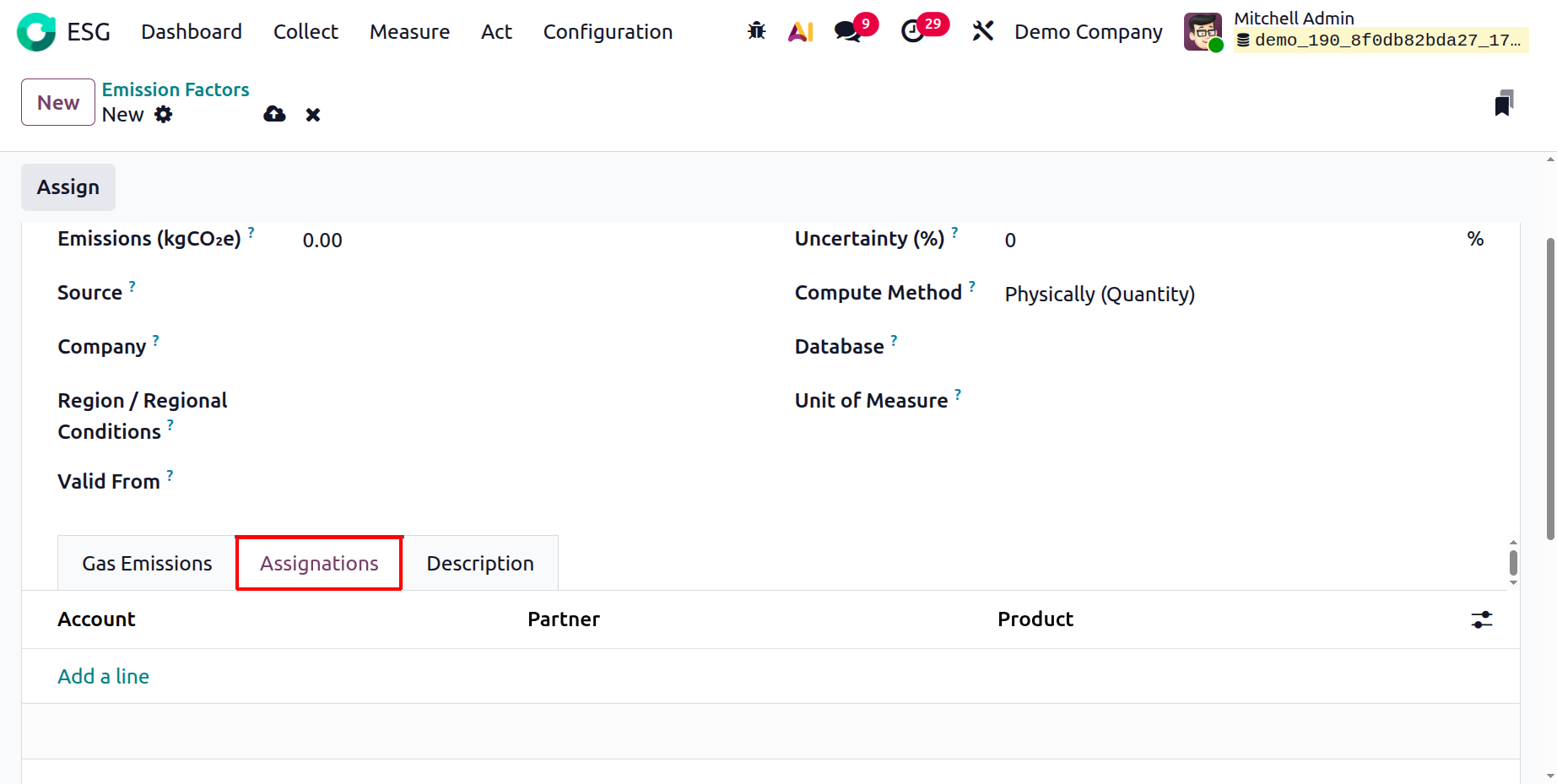 In the Uncertainty (%) field, you can view the percentage of error in the emission value. You can select the Compute Method as Physically (Quantity) or Monetary to tell Odoo how the emission should be calculated. In the Database field, you can add a reference database used for the emission factor values. You can specify the unit that the emission factor applies to in the Unit of Measure field. Here, you can also view three tabs: Gas Emissions, Assignations, and Description.