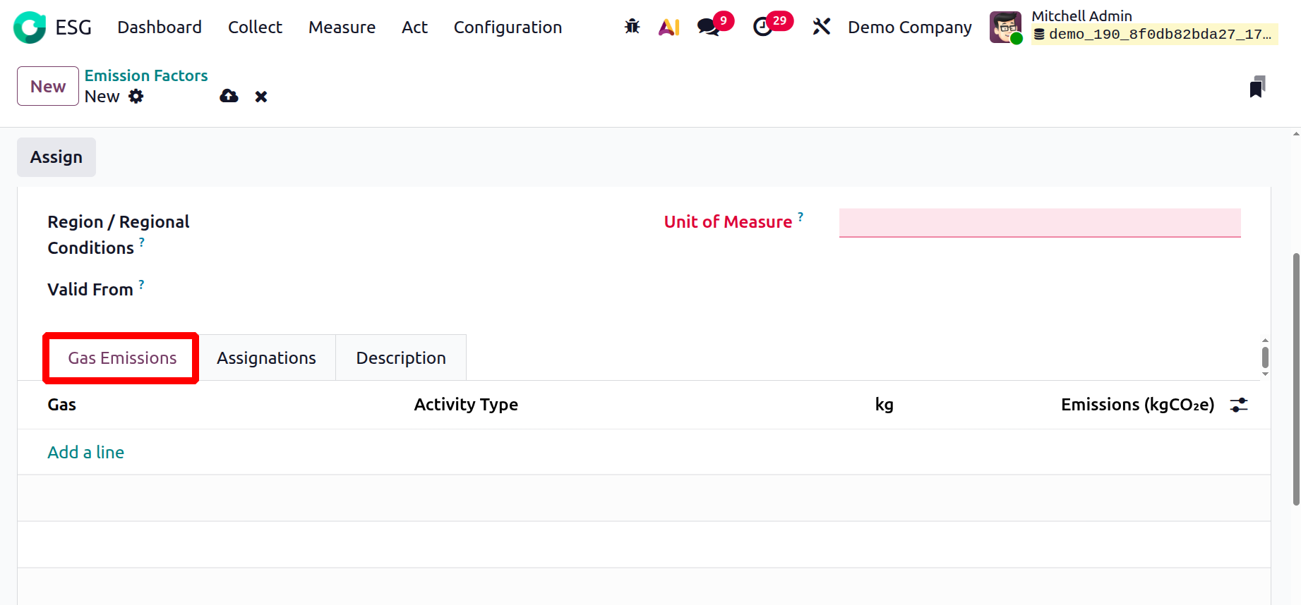 Under the Gas Emissions tab, click the Add a line button to add more gas types for the same activity. You can also show what kind of activity the factor is related to in the Activity Type section. Then, add the kg and emission value of the gas.