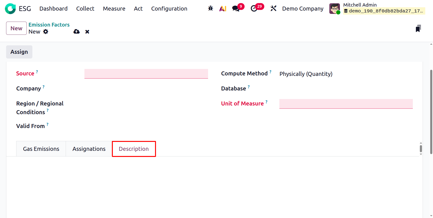 Under the Description tab, add a short note about the emission factor. After entering all the details, click the Assign button to save the emission factor.