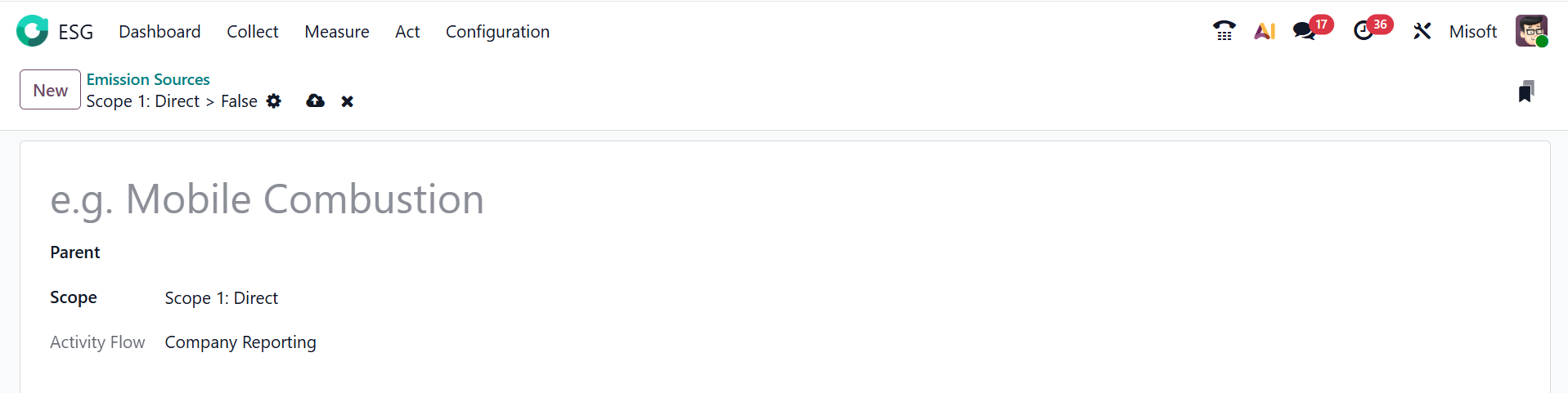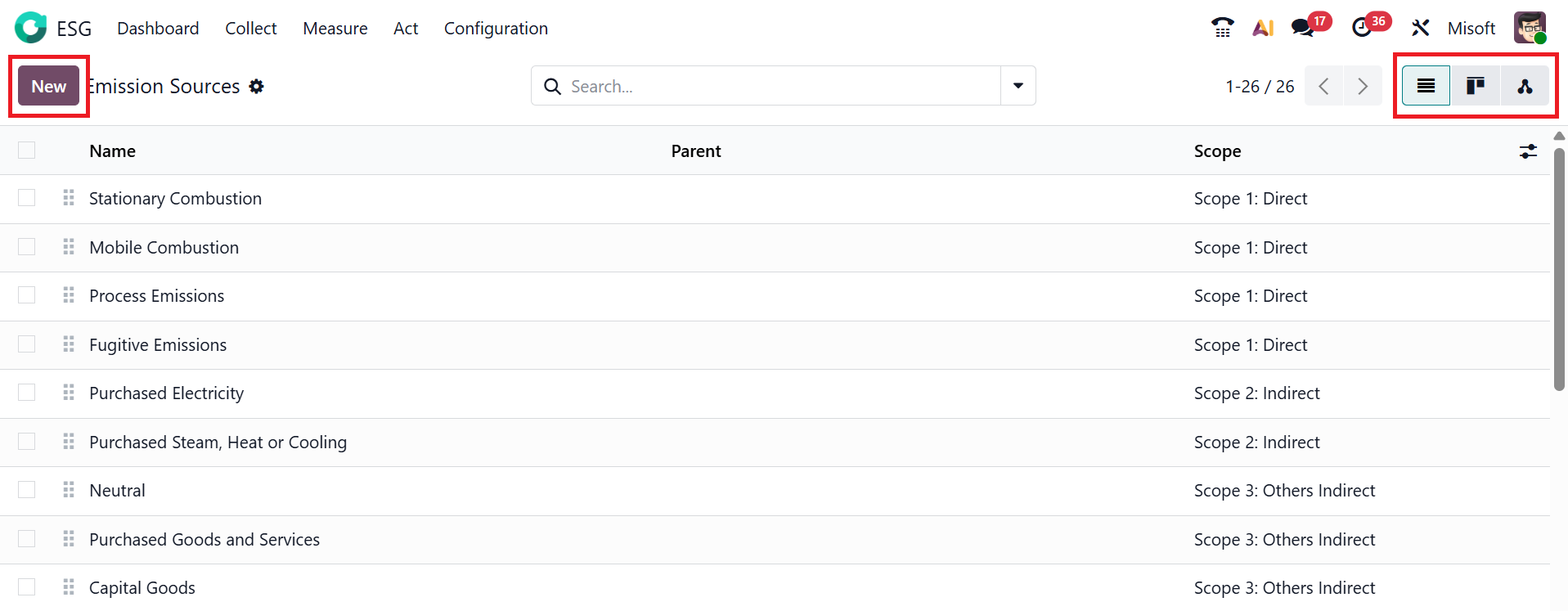 In the Odoo 19 ESG module, Emissions Sources refer to the activities within the company that produce CO2 emissions. Here, you can view the details of the emission sources, such as Name, Parent, and Scope. You can view the emission sources in List, Kanban, or Hierarchy views. To create a new emission source, click on the New button as shown below: