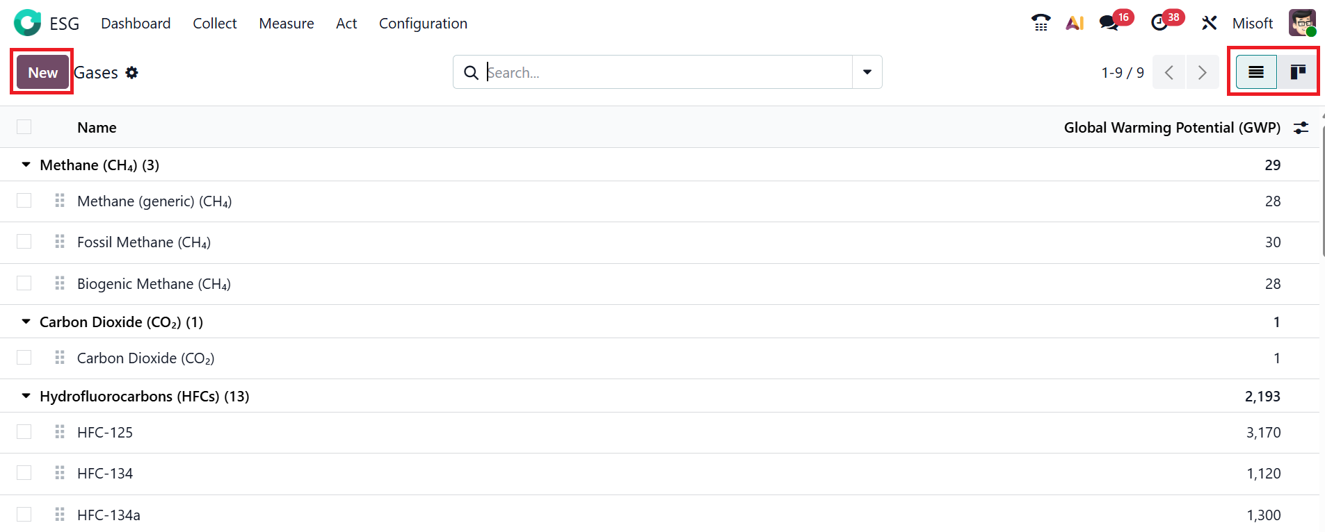 Under the Gases option in the Configuration menu, you can view a list of greenhouse gases that are emitted and used to calculate the total carbon emissions. Here, you can view the details of the gases, such as Name and Global Warming Potential (GWP). You can also view the gases option in List and Kanban views. Click on the New button to add a new greenhouse gas for the emission factor.