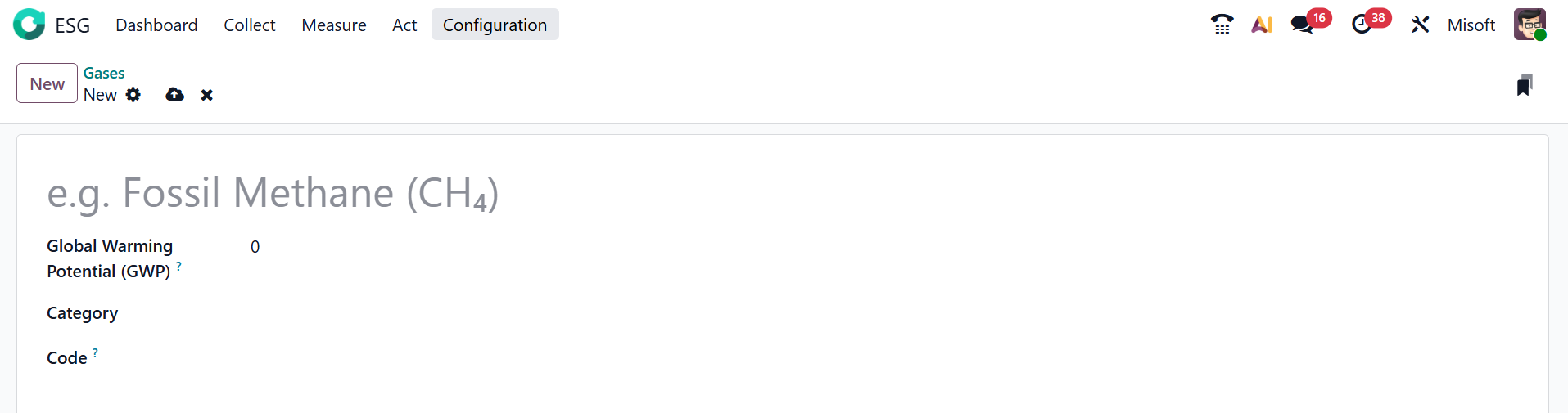 Here, add the name of the gas. The Global Warming Potential (GWP) field indicates the relative contribution of a gas to global warming compared to CO2. You can add the group or classification of the gas in the Category field. To easily recognize the gas, add a short reference in the Code field.