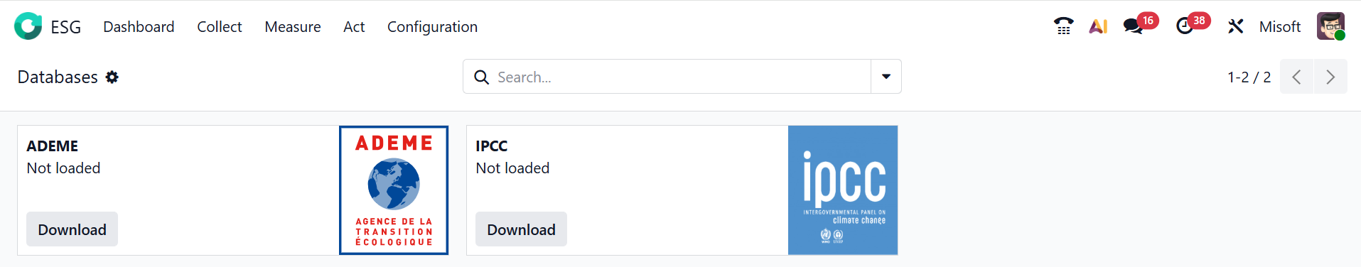 In the Odoo 19 ESG module, Source Databases refers to the external databases from which you can take emission factors and data. Here, you can access two databases to download the emission factors.