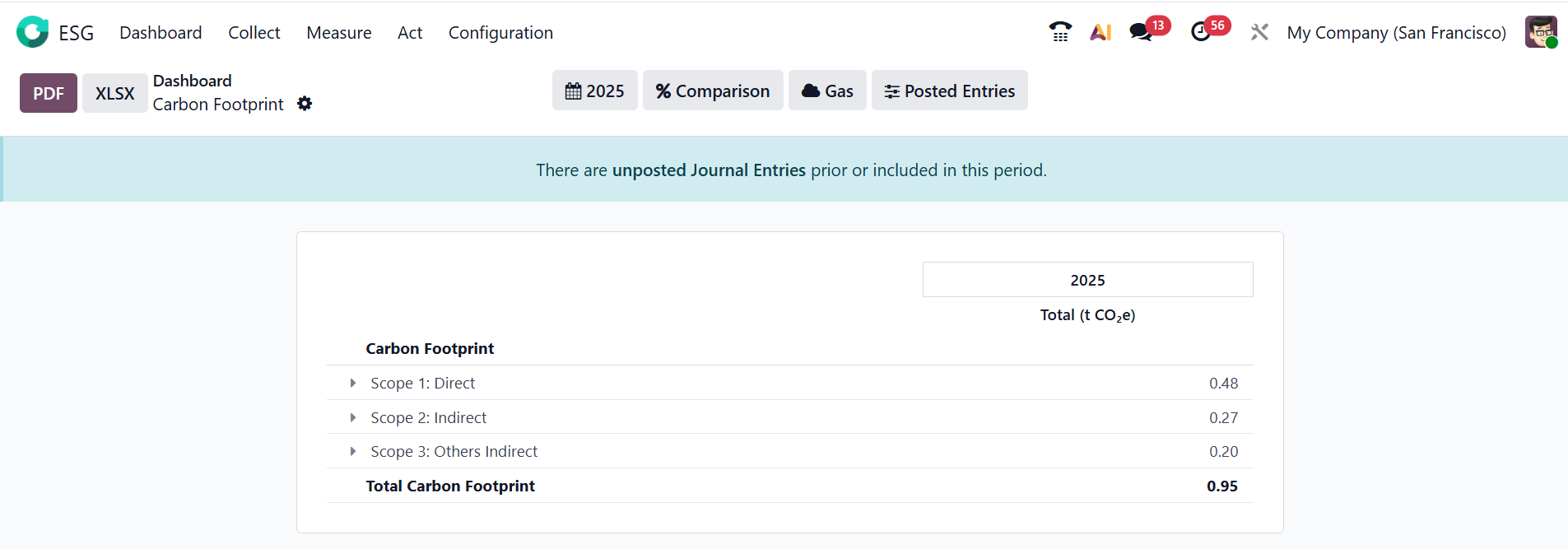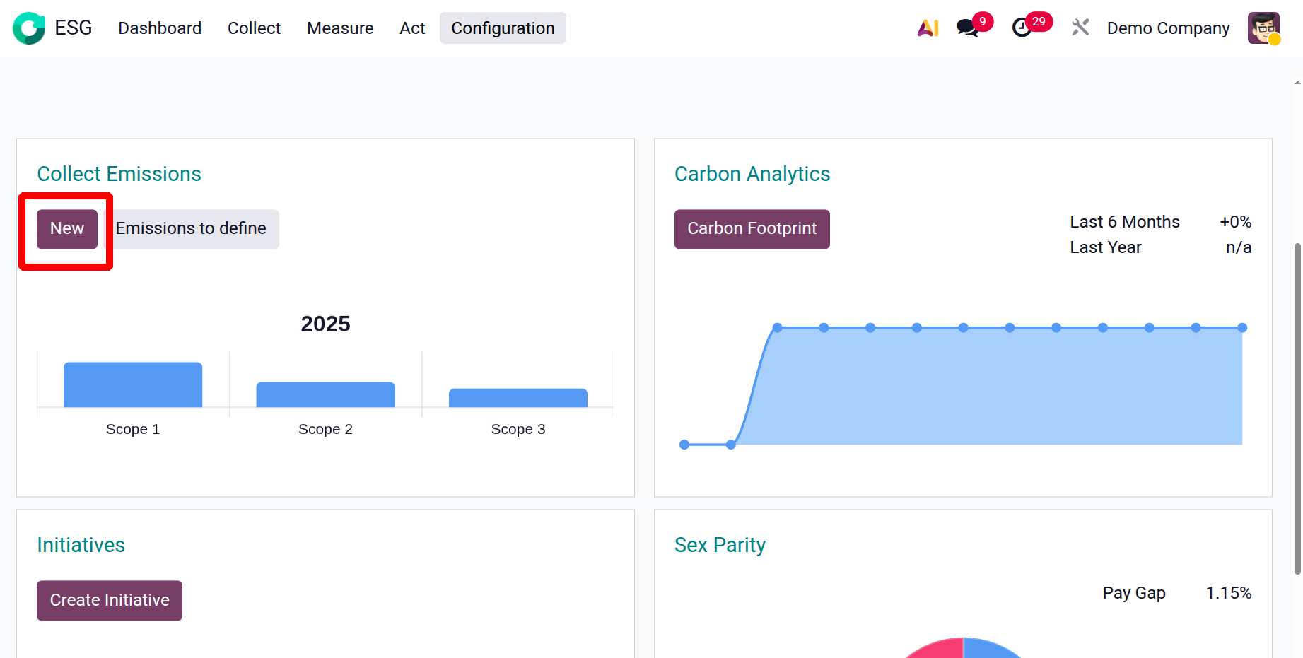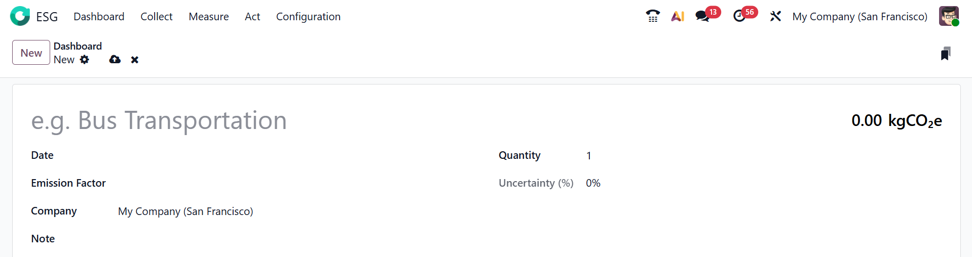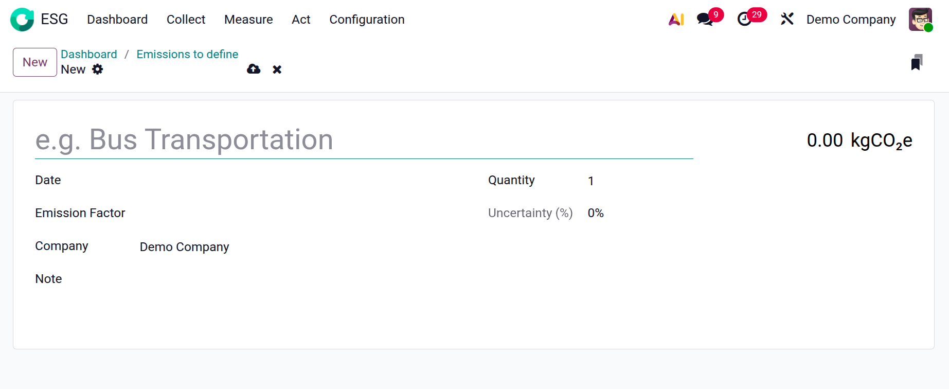 - *Collect:The first stage in the ESG workflow is Collect. This stage enables organizations to collect all ESG-related data seamlessly from both Odoo and external sources. The data includes emissions, energy usage, water consumption, and social impact metrics
