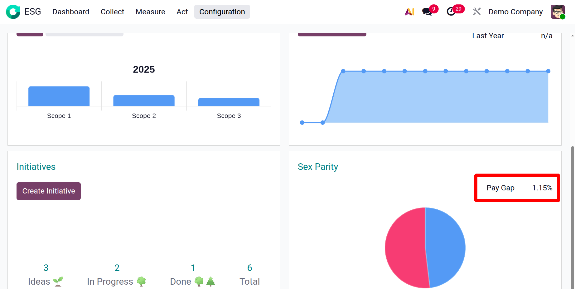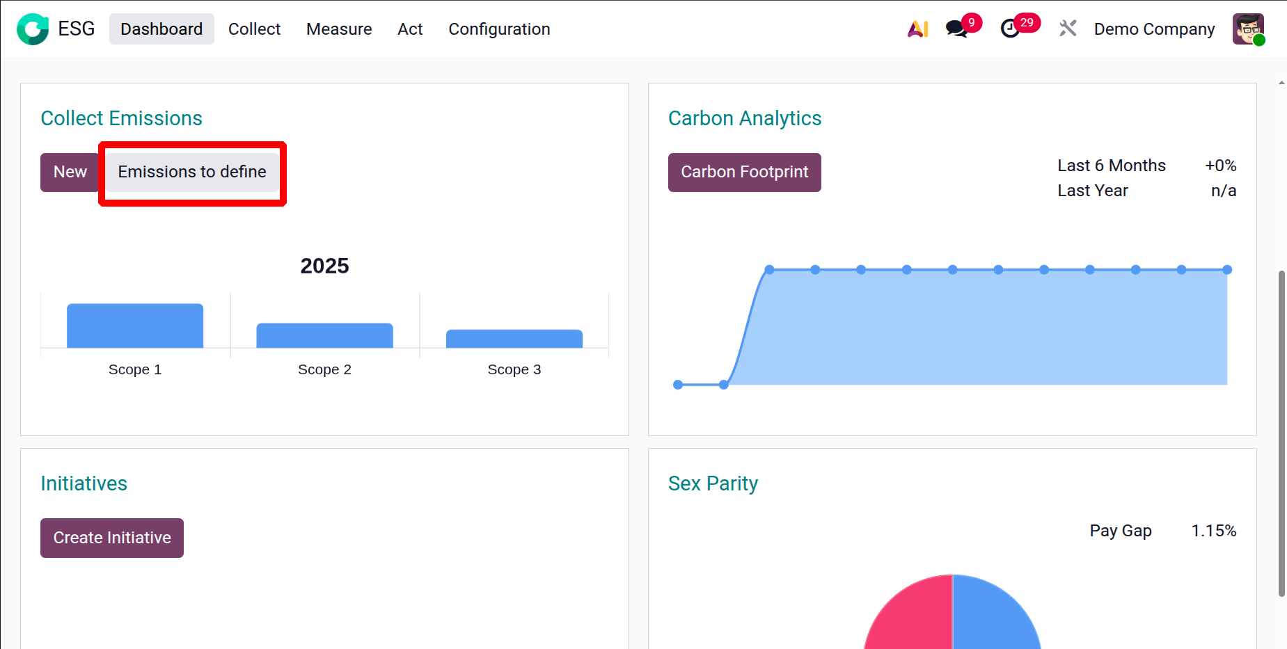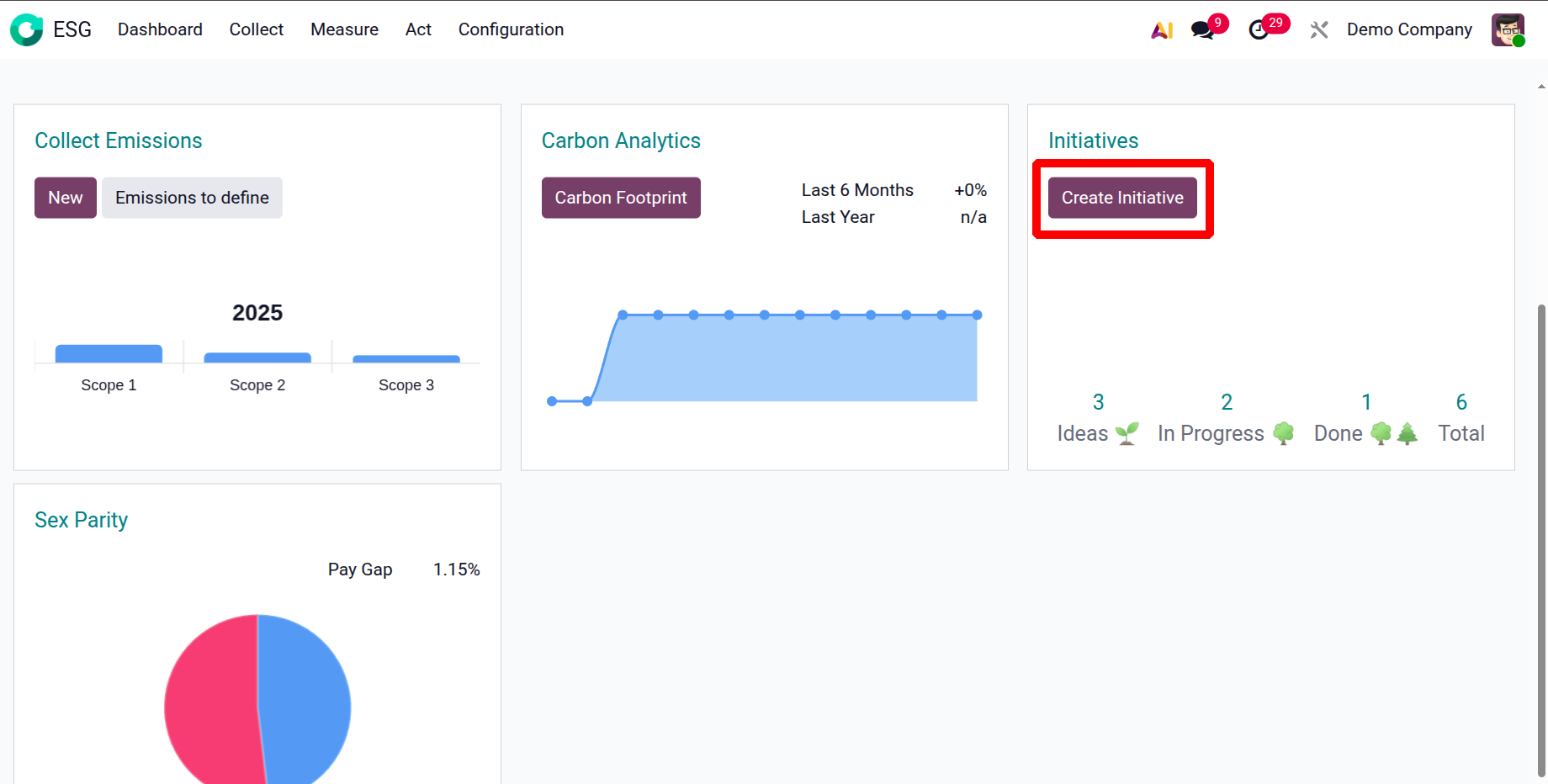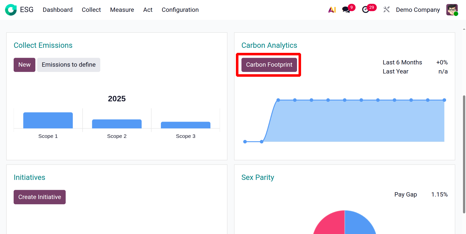 You can view four dashboard sections: Collect Emissions, Carbon Analytics, Initiatives, and Sex Parity.