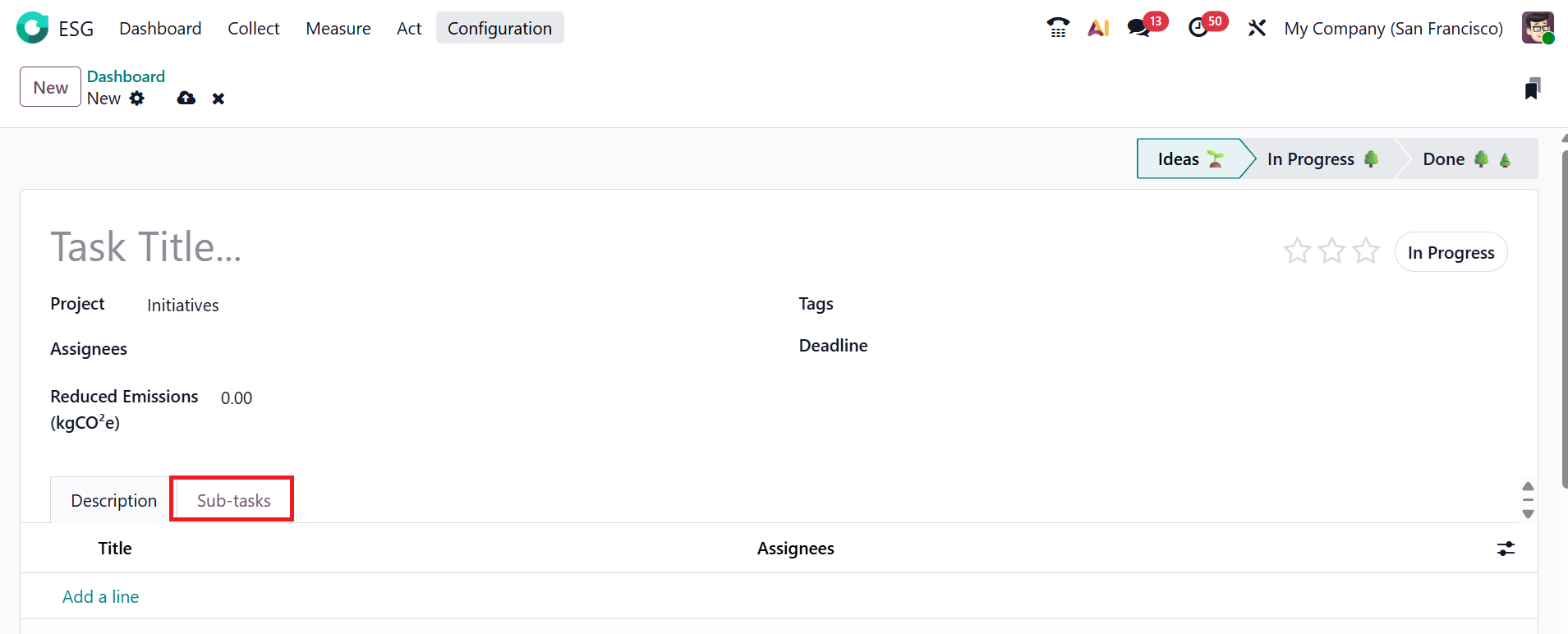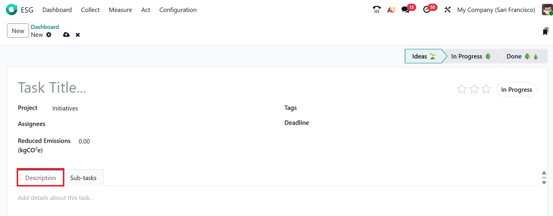 Enter a title for the task, select a Project under which the task falls (here, it is Initiatives), and add Assignees—employees or team members responsible for completing the task. You can view the estimated or actual reduction in carbon emissions achieved through this task in the Reduced Emissions (kgCO2e) field. Use appropriate Tags to categorize the tasks. In the Deadline field, enter a target date for completing the task. In the Description tab, you can provide detailed information about the task.