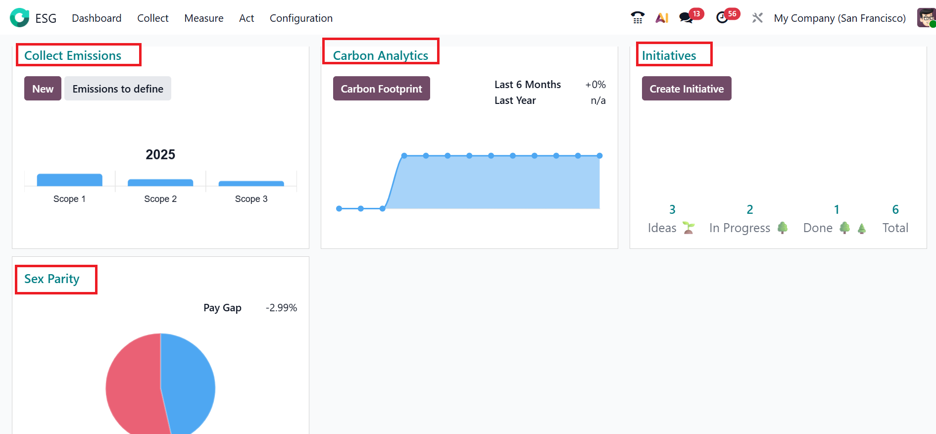 When you open the ESG module in Odoo 19 Enterprise, the system displays the Dashboard menu as the module's default dashboard. The Dashboard menu serves as a centralized platform where companies can Collect, Measure, and Act upon data related to sustainability, ethical practices, and corporate governance.
