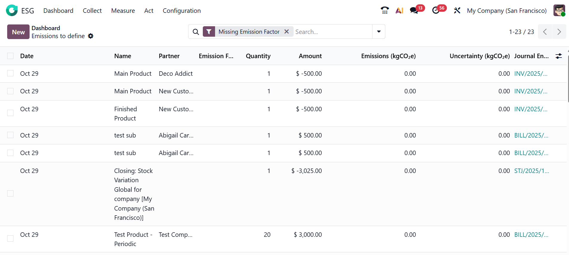 To create a new emission report, click the New button and follow the steps described above. Here, you can view the details of the emission reports, such as Date, Name, Partner, Emission Factor, Quantity, Amount, Emissions (kgCO2e), Uncertainty (kgCO2e), and Journal Entry.