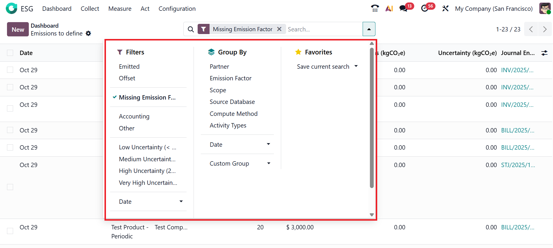 When you click on the drop-down menu in the search bar, you can view three options: Filters, Group By, and Favorites. These tools help to categorize the emission reports for quick access. Under the Filters menu, you can view the options such as Emitted, Offset, Missing Emission Factor, Accounting, Other, Low Uncertainty (<5%), Medium Uncertainty (5-20%), High Uncertainty (20-50%), Very High Uncertainty (>50%), and Date. Users can also create a Custom Filter or use the new Ask AI option for intelligent search assistance. Under the Group By option, you can group the emission reports based on Partner, Emission Factor, Scope, Source Database, Compute Method, Activity Types, Date, and also create a Custom Group. The Favorites menu helps save the current search for quick access.
