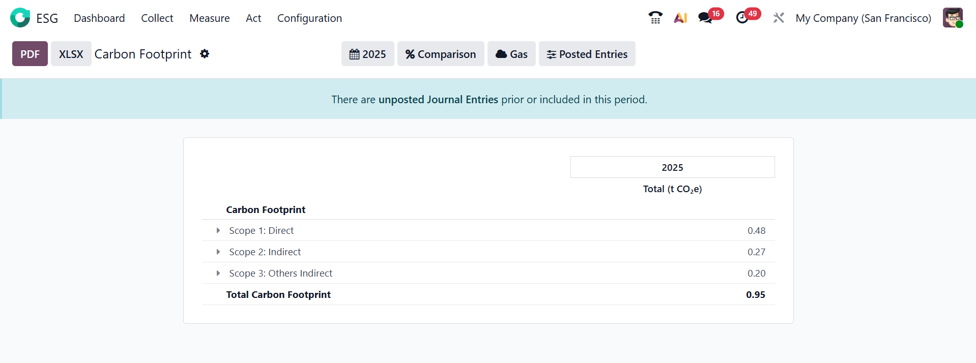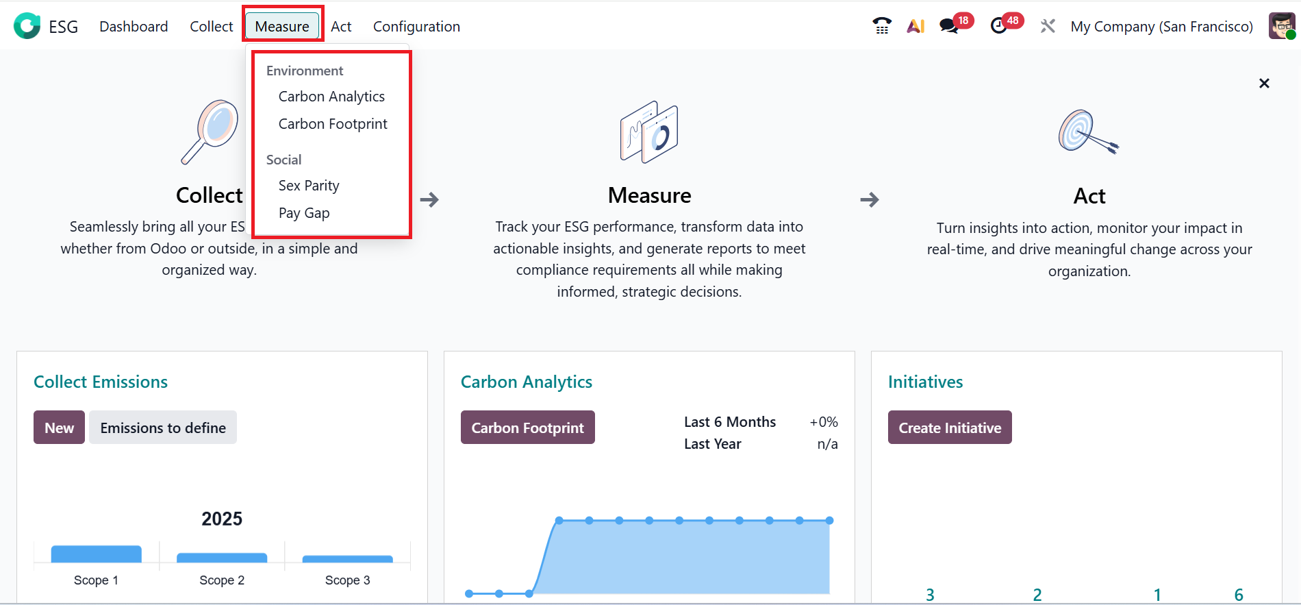 In the Odoo 19 ESG module, the Measures menu is used to define, track, and monitor key sustainability performance indicators related to environmental, social, and governance (ESG) aspects. Users can set targets, record actual results, and compare their performance against goals to assess progress. This stage is regarded as the second step in the ESG process. Here, you can see two sections: Environment with Carbon Analytics and Carbon Footprint options. Social with Sex Parity and Pay Gap options.
