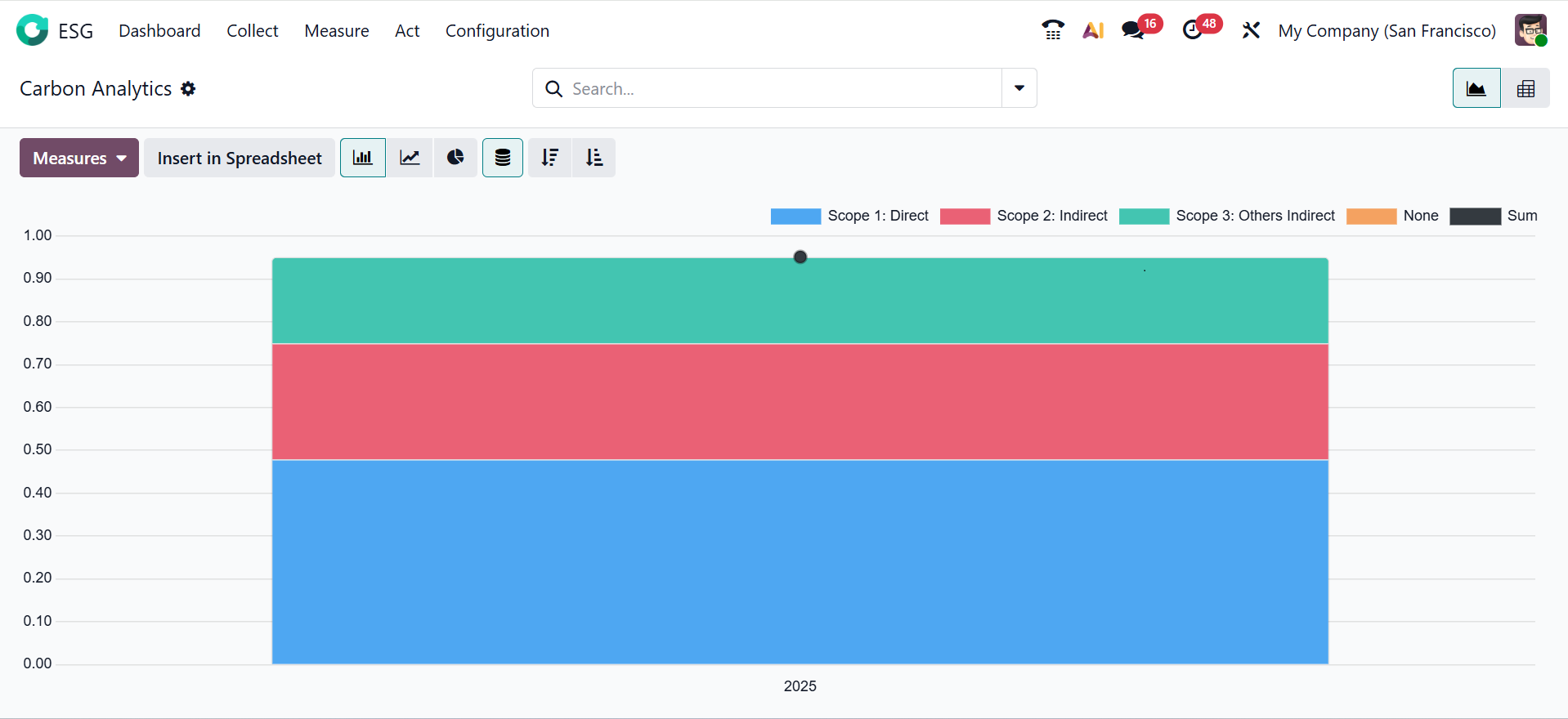 The Carbon Analytics in the Odoo 19 ESG module refers to the analysis and visualization of carbon emission data collected from each scope. The X-axis shows the year of the carbon emissions, and the Y-axis shows the amount of carbon emissions. The graph uses different colors to represent each emission scope. You can view the Carbon Analytics in Graph and Pivot views. You can use the Graph as a Bar chart, Line chart, Pie chart, Stacked chart, or as a Chart with Ascending or Descending Data.