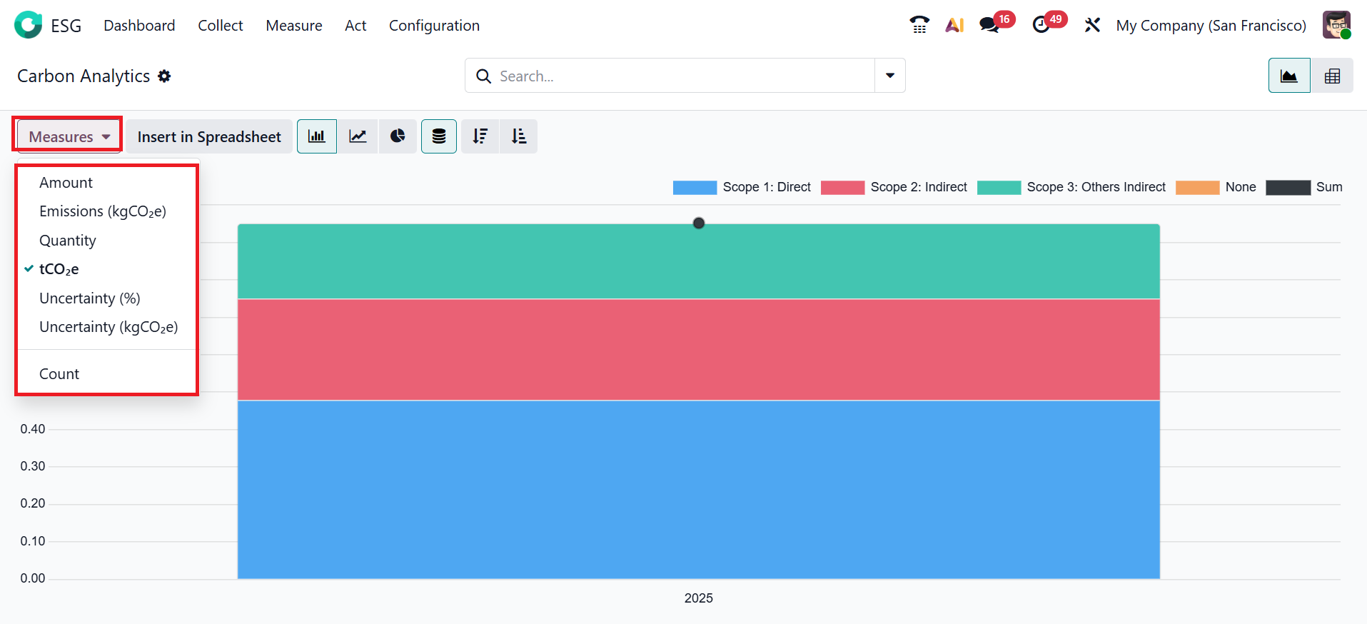 Click on the Measures button to change the value of the graph, such as Amount, Emissions (kgCO2e), Quantity, tCO2e, Uncertainty(%), Uncertainty (kgCO2e), and Count.