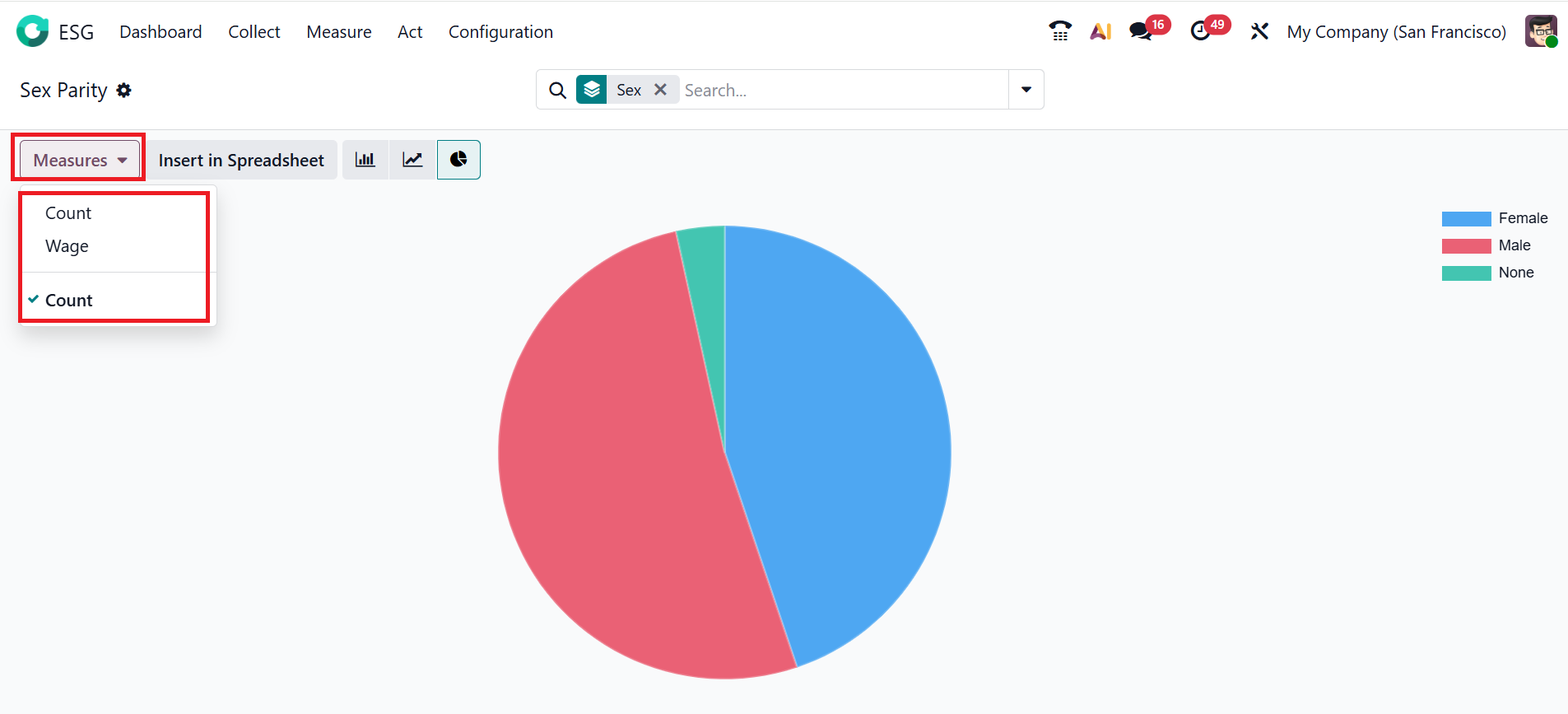 Click the Measures button to adjust the values displayed in the chart. By default, Sex Parity is in a Pie chart; you can change it into a Line chart, Bar chart, Stacked, Ascending, or Descending.