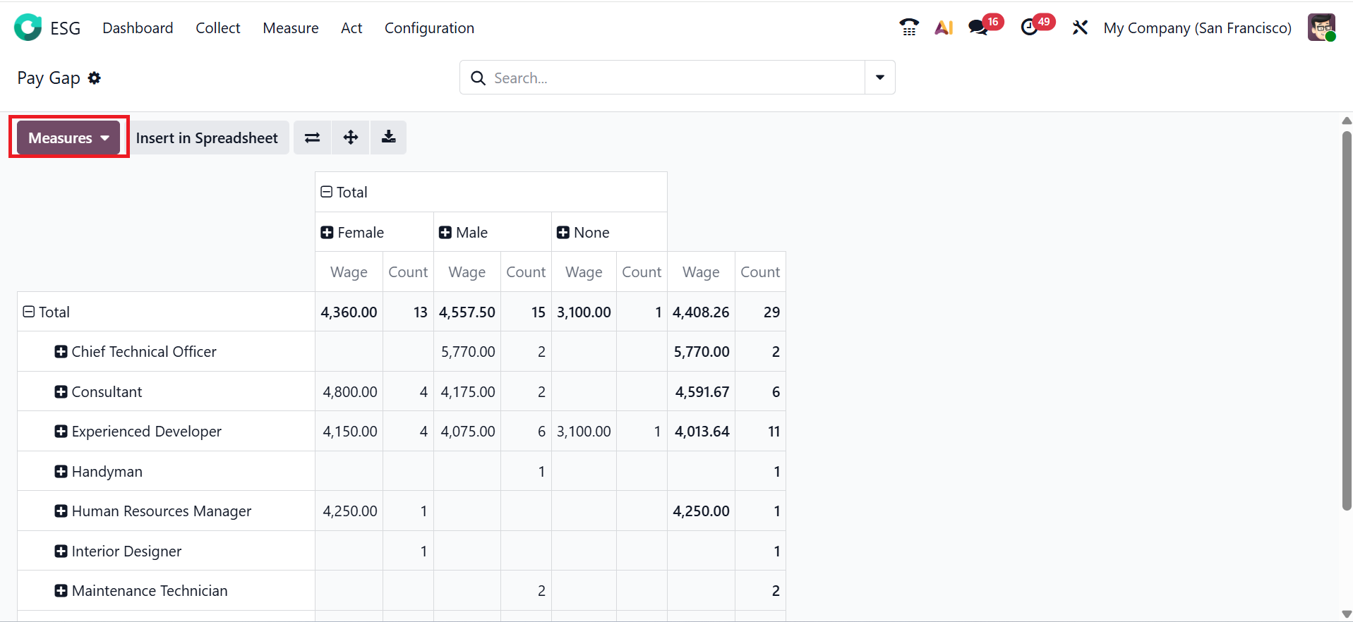 In Odoo 19 ESG, the Pay Gap indicates the disparity between the average salaries of male and female employees in the organization. In Pivot view, the Pay Gap helps analyze gender-based income inequality, enabling companies to ensure fair and equal pay practices. Click on the Measures button to add metrics such as Count, Wage, and Leadership Level.
