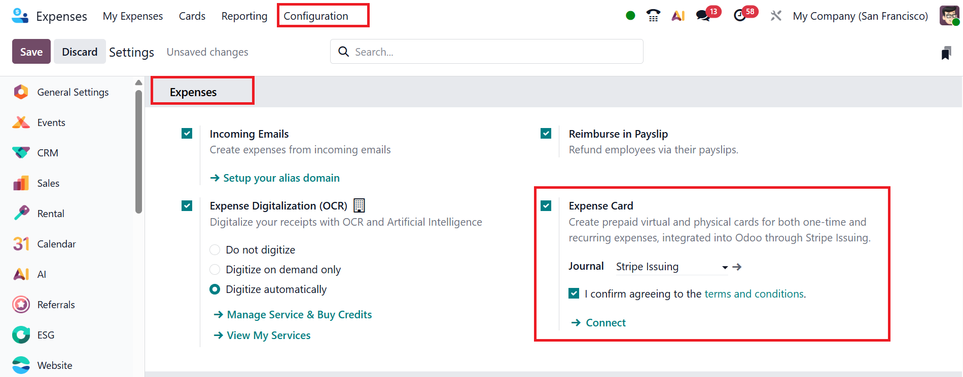 To access the Cards menu, navigate to the Configuration > Settings, and enable the Expense Card option as shown below: