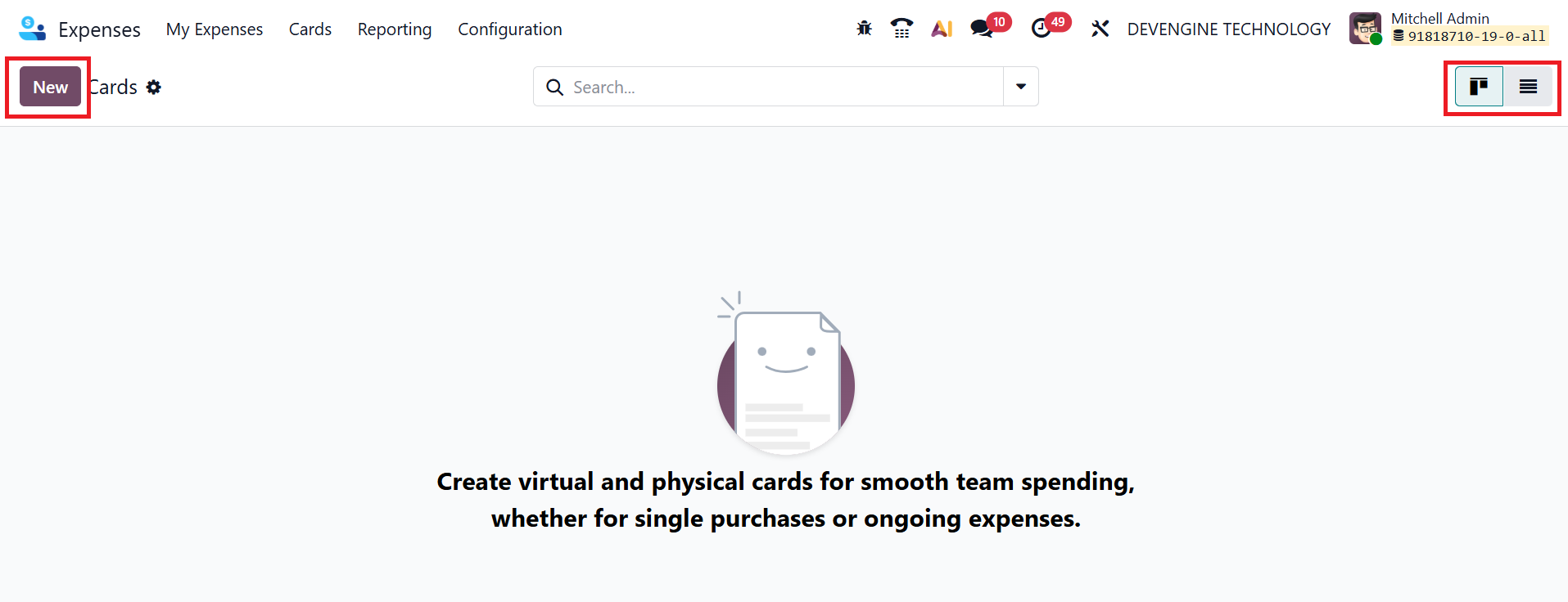 The Cards menu, which is a new feature in the Odoo 19 Expense module, is used to manage company or business credit cards (both physical and virtual) issued to employees. It allows businesses to automatically control, track, and record expenses made with these cards.
