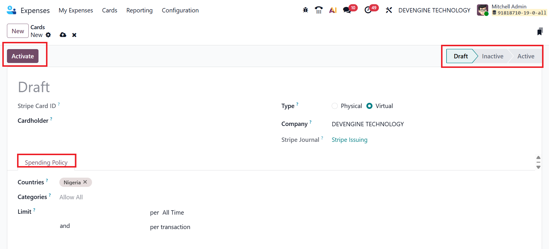 Under the Spending Policy tab, select which countries the card can be used in. In the Categories field, specify which purchase types are allowed. In the Limit field, specify how much can be spent within a time frame or per transaction. After entering all the details, click the Activate button to enable the card. Then, it moves from the draft stage to the Inactive and Active stages..