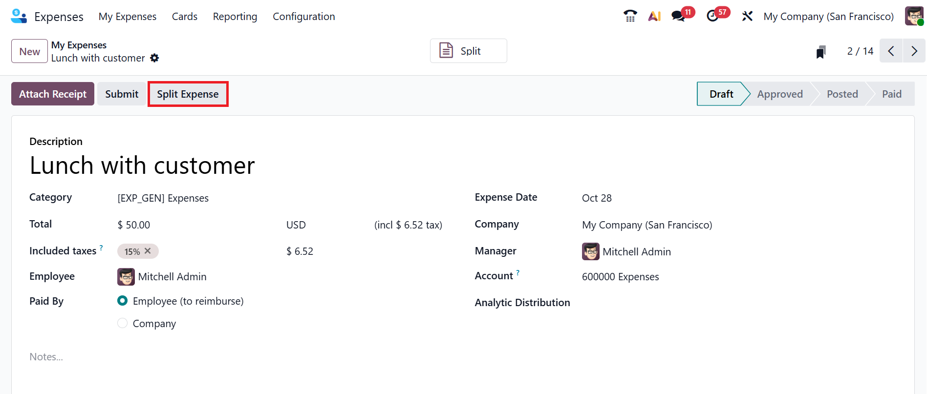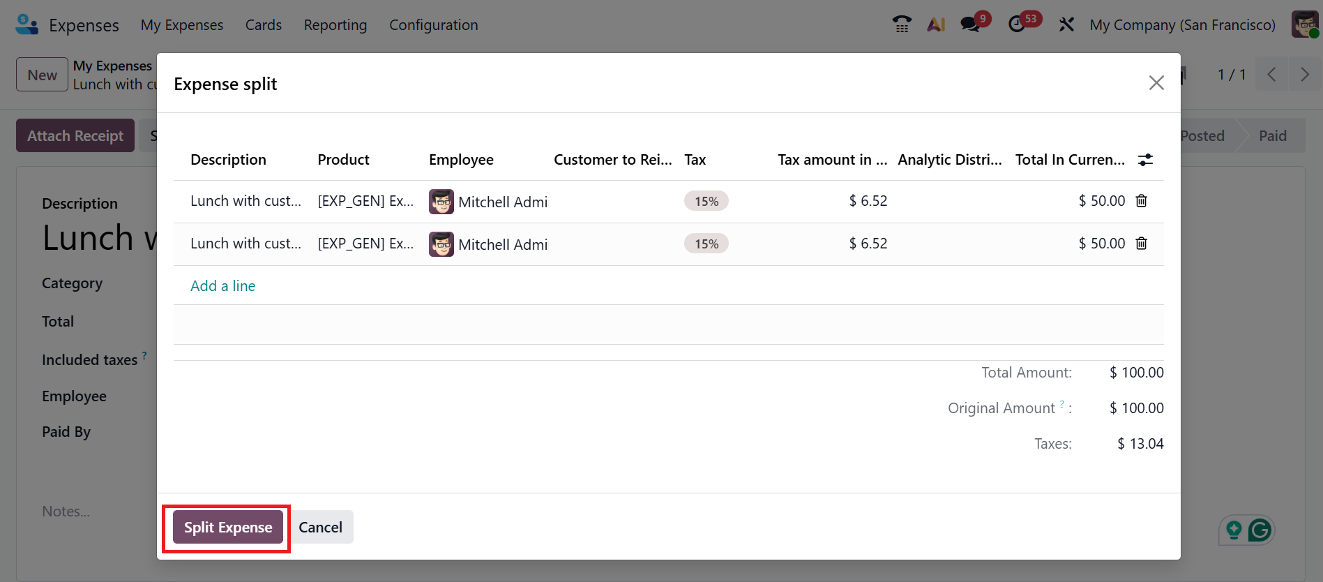 A new pop-up window will appear, where you can view the details of the expense split, such as Description, Product, Employee, Customer to reinvoice, Tax, Tax amount in Currency, Analytic Distribution, and Total In Currency. Click the Split Expense button as shown below.