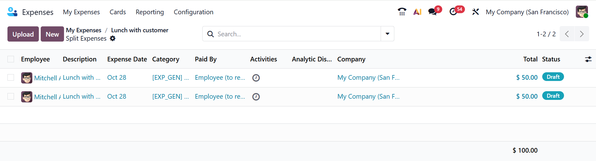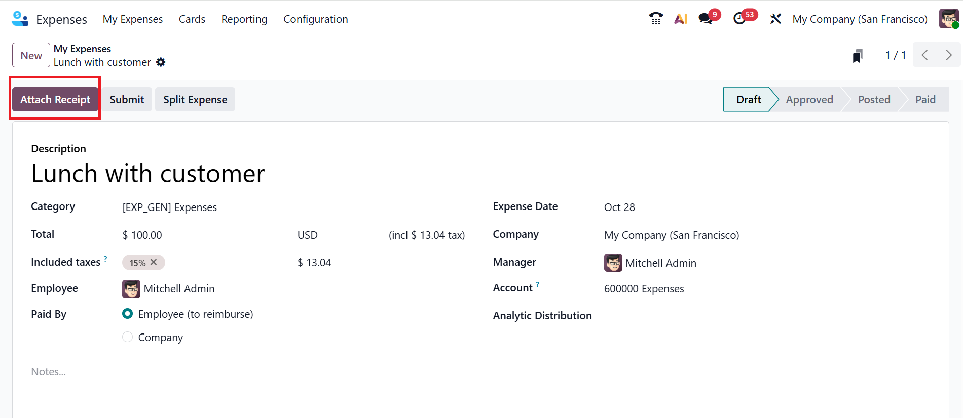 After confirmation, the expense report is moved to the Submitted stage from the Draft stage as shown below: