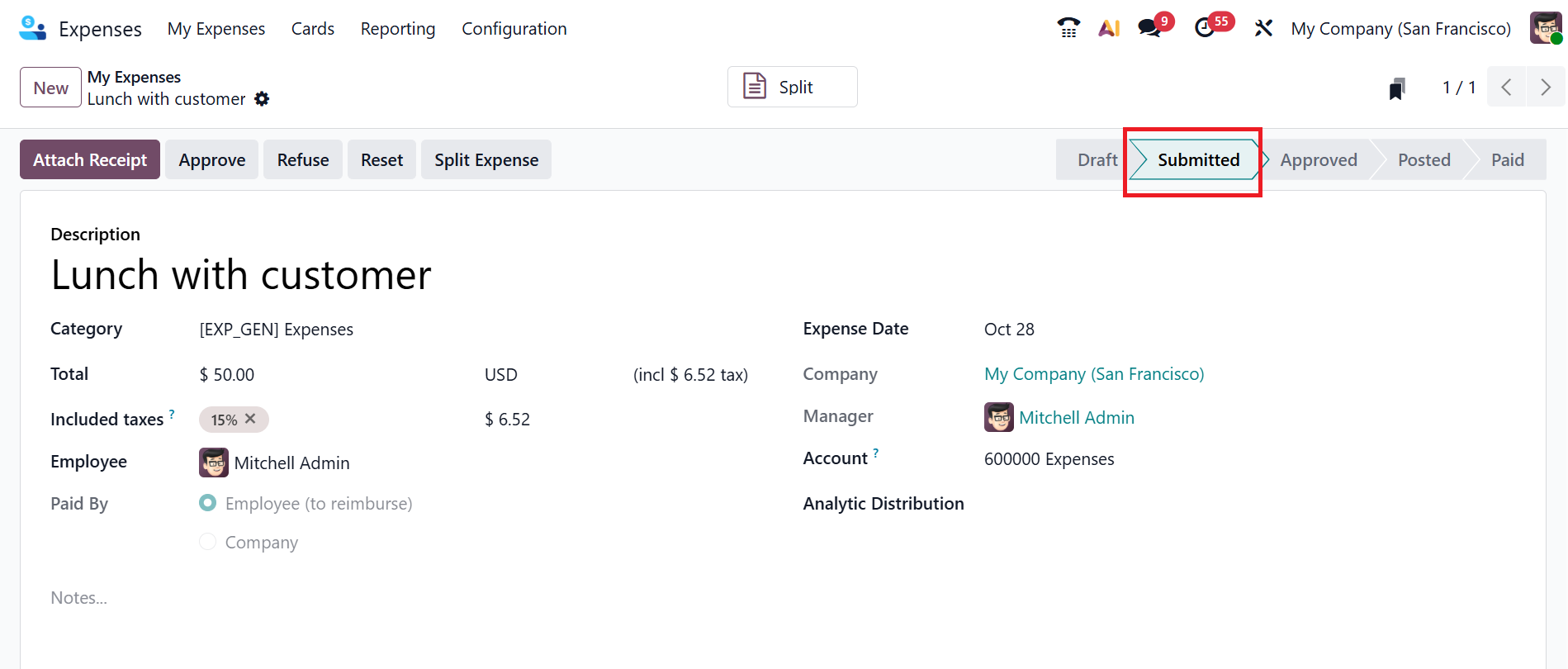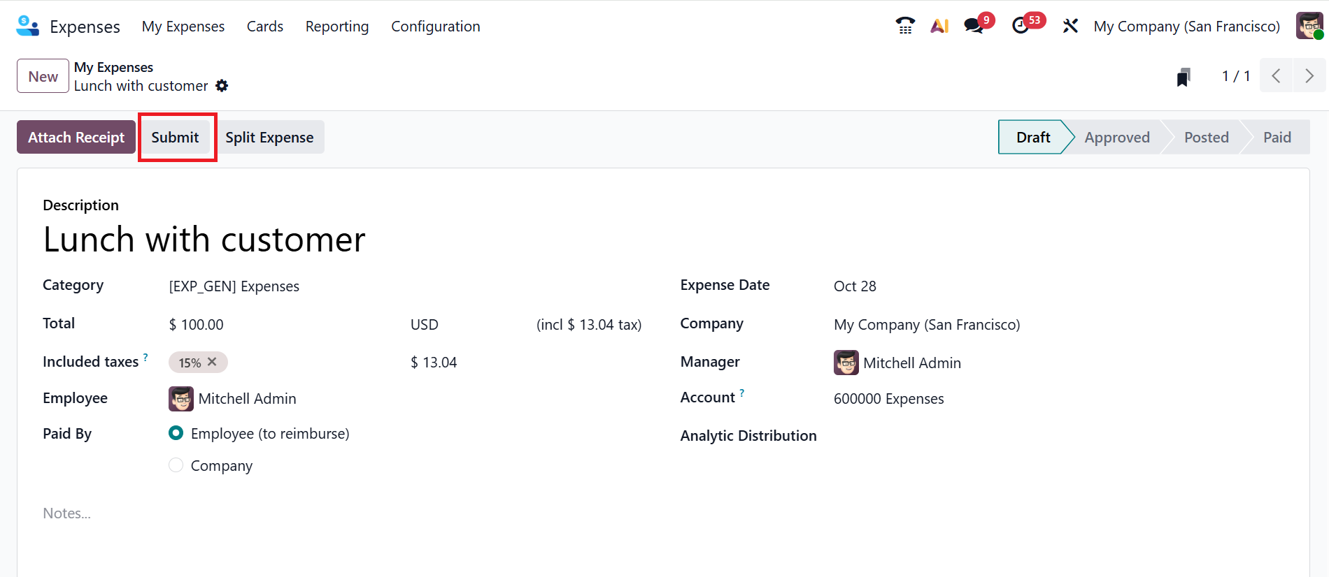- *To Submit:To Submit stage includes expenses that an employee has created but not yet submitted for approval. They are still in draft form and can be edited or deleted.