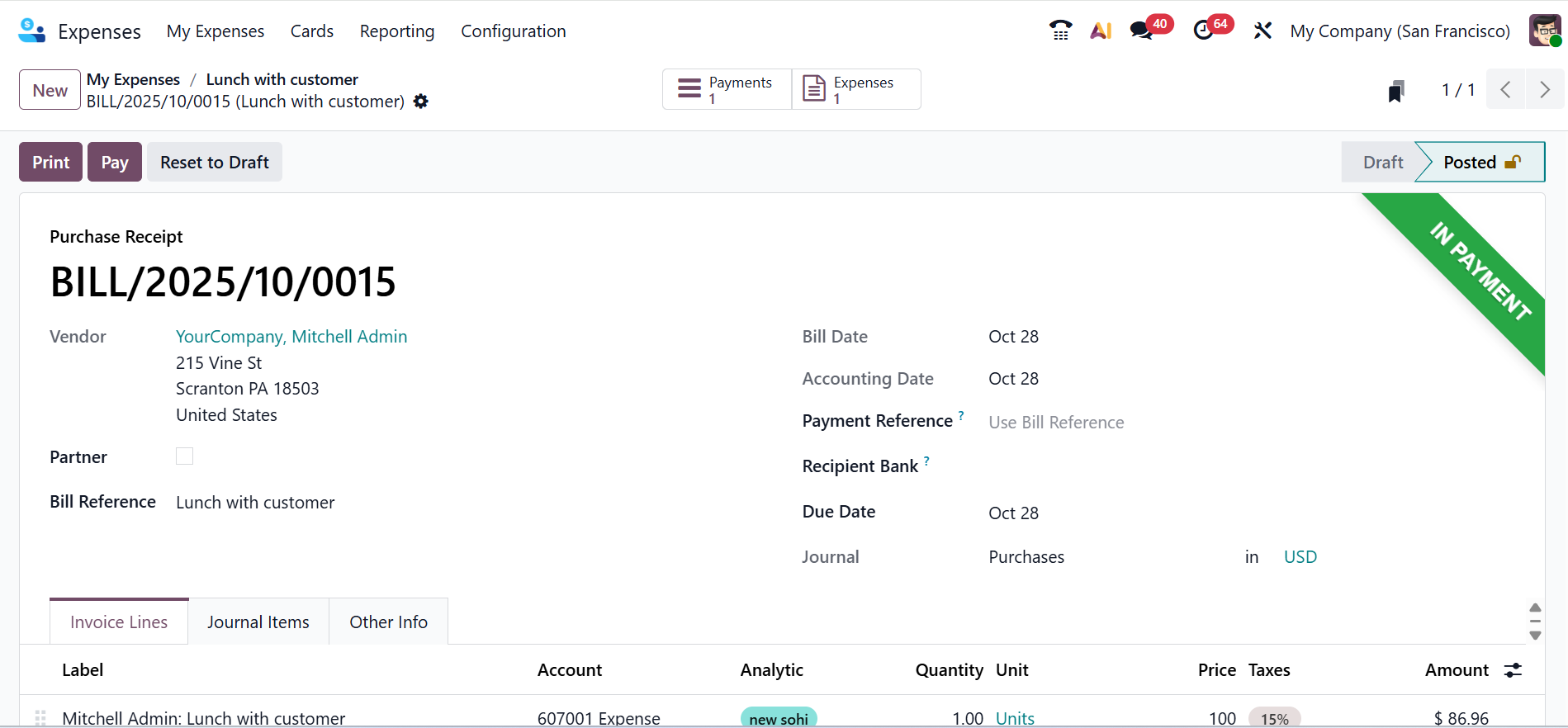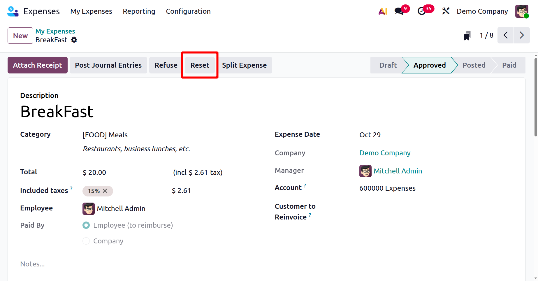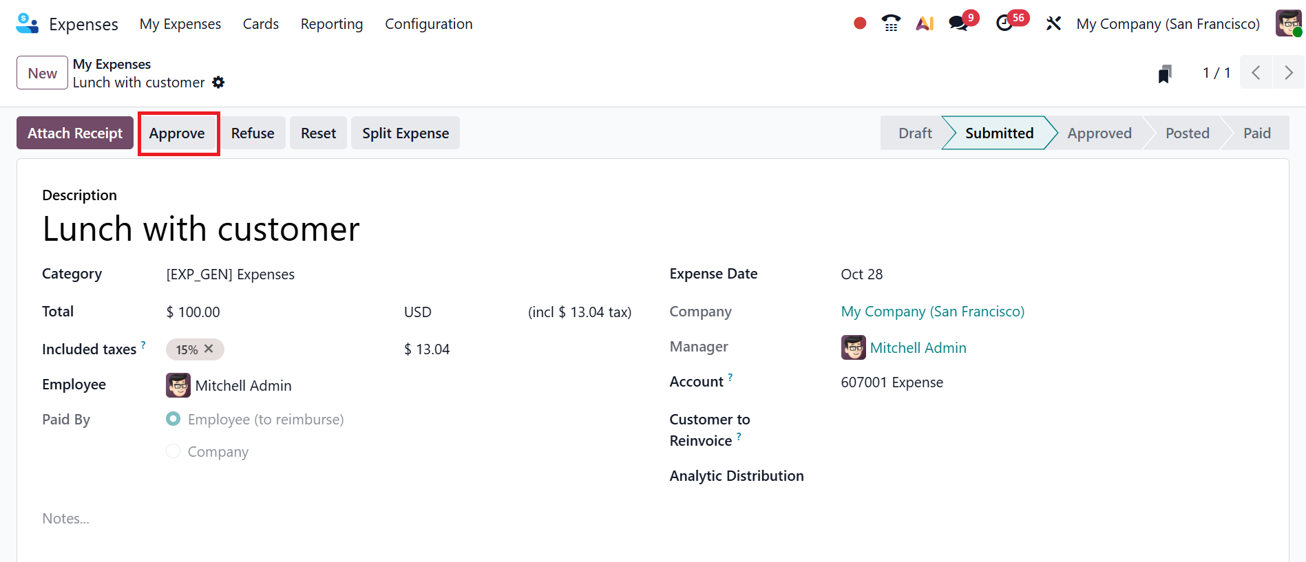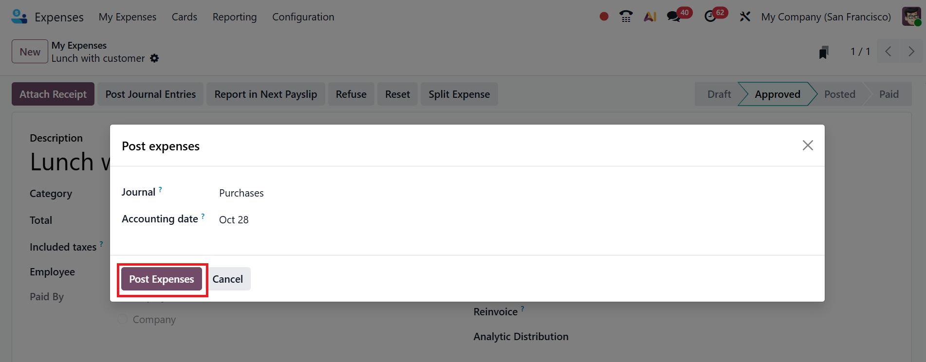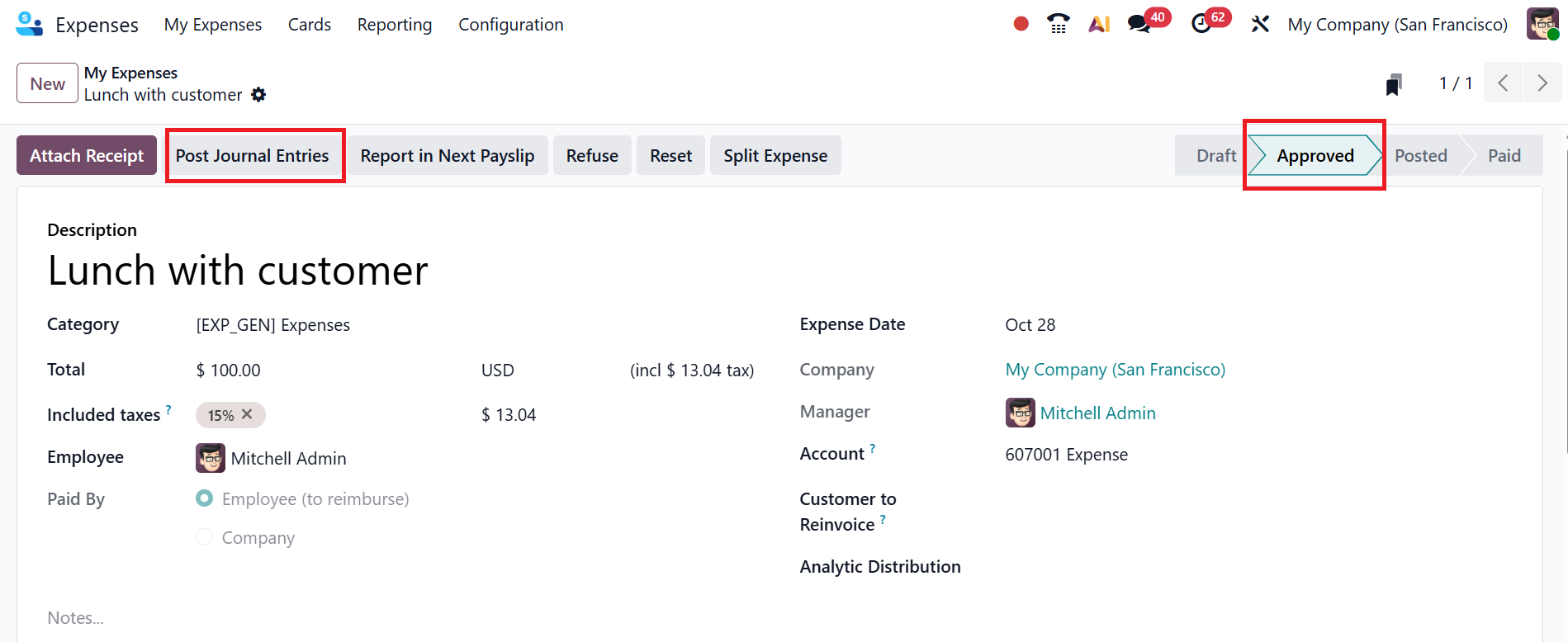 Then, you can see the expense report is in the Approved stage. Select the Post Journal Entries button to post the expenses to the appropriate accounting journal.