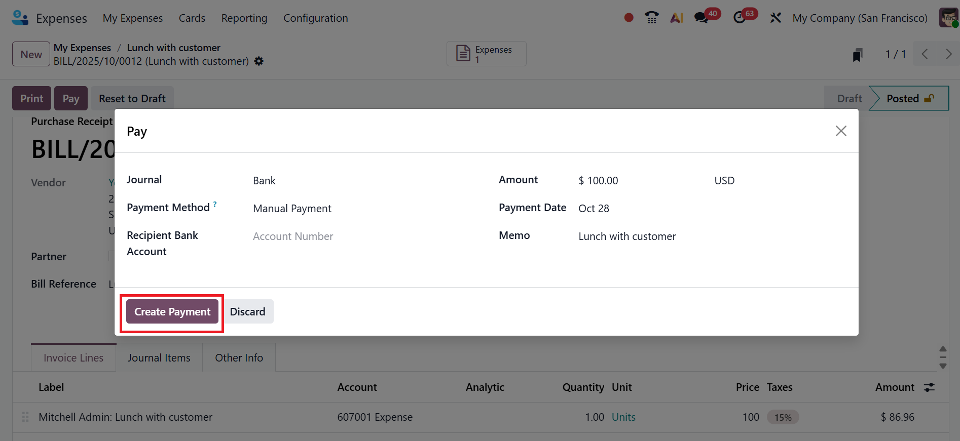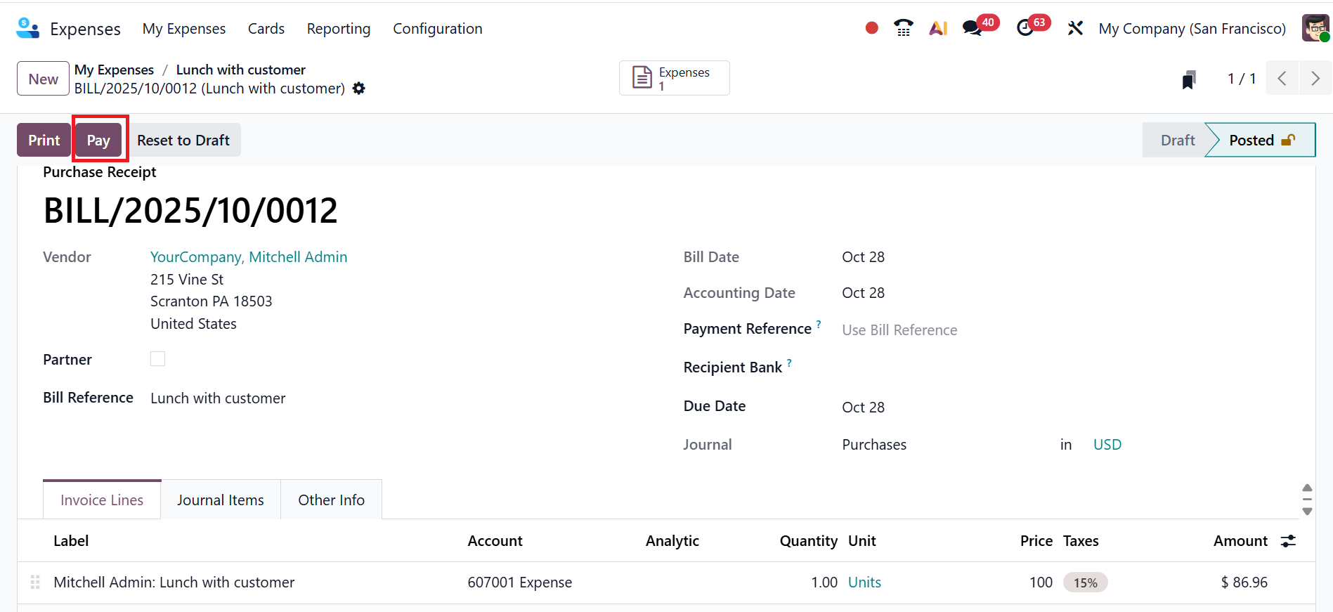 Here, you can see the bill is in the Posted stage, and click on the Pay button to pay the bill.