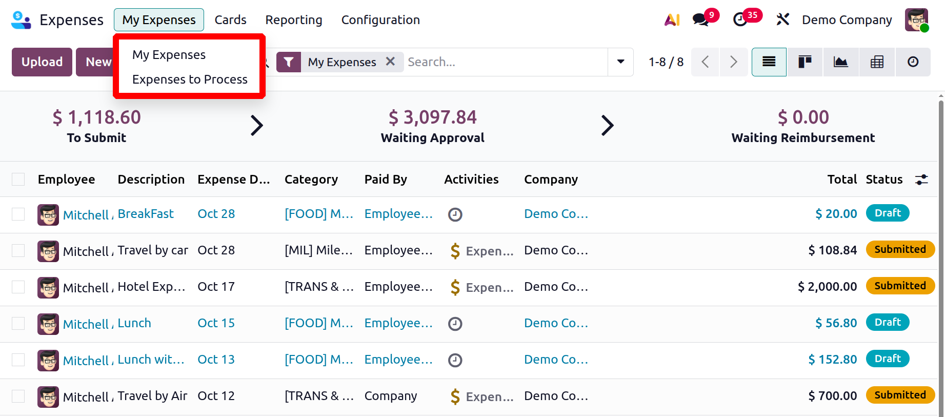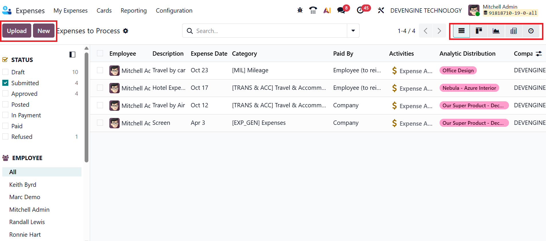 The Expenses to Process option in Odoo 19 displays all submitted employee expenses awaiting approval, validation, or payment. It helps managers and accountants efficiently review, approve, or reimburse pending expenses. To upload a receipt, click the Upload button; to create a new expense report manually, click the New button, as explained in the above section. By default, expense records are displayed in List view. You can also change the view to Kanban, Graph, Calendar, or Activity.
