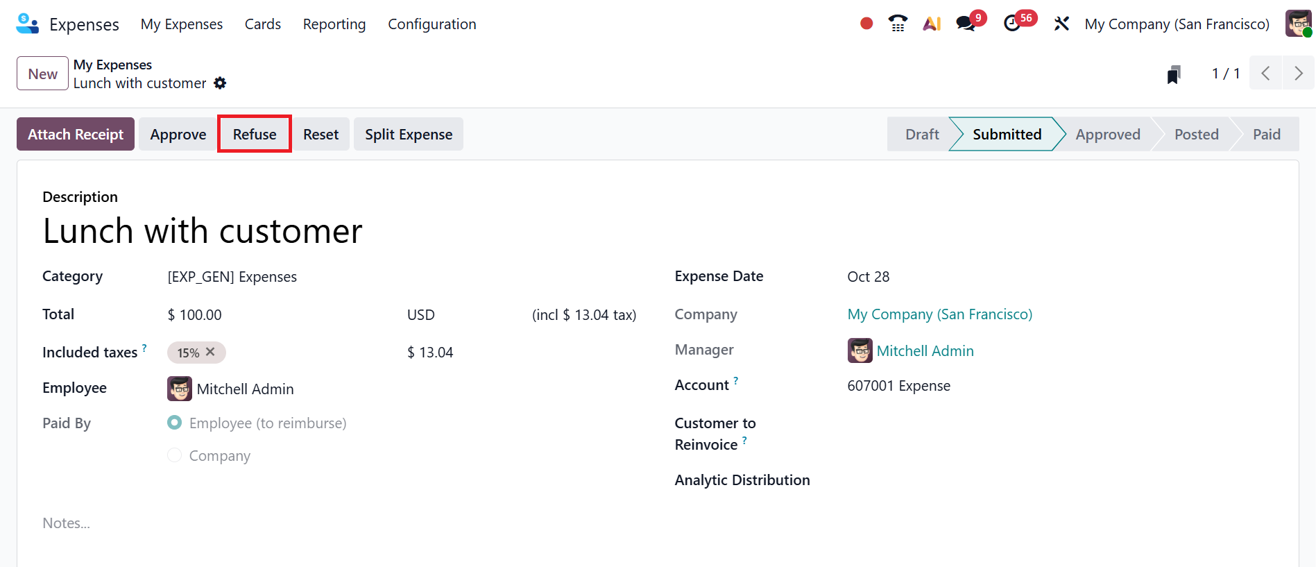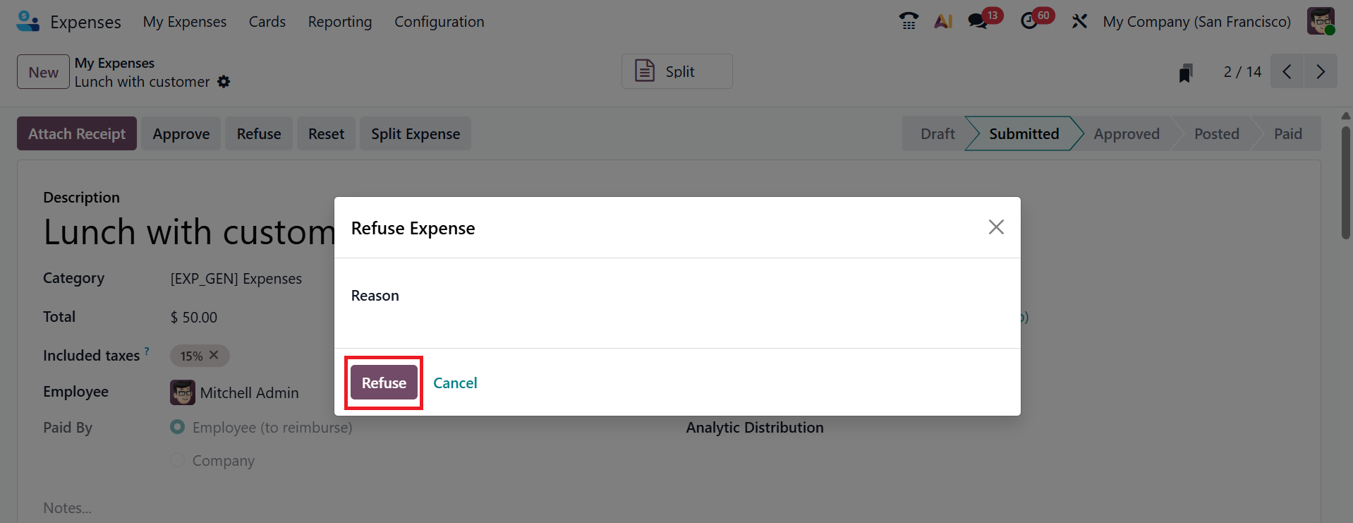 A new pop-up screen will appear, where you can add a reason to refuse the expense. Then, click on the Refuse button as shown below: