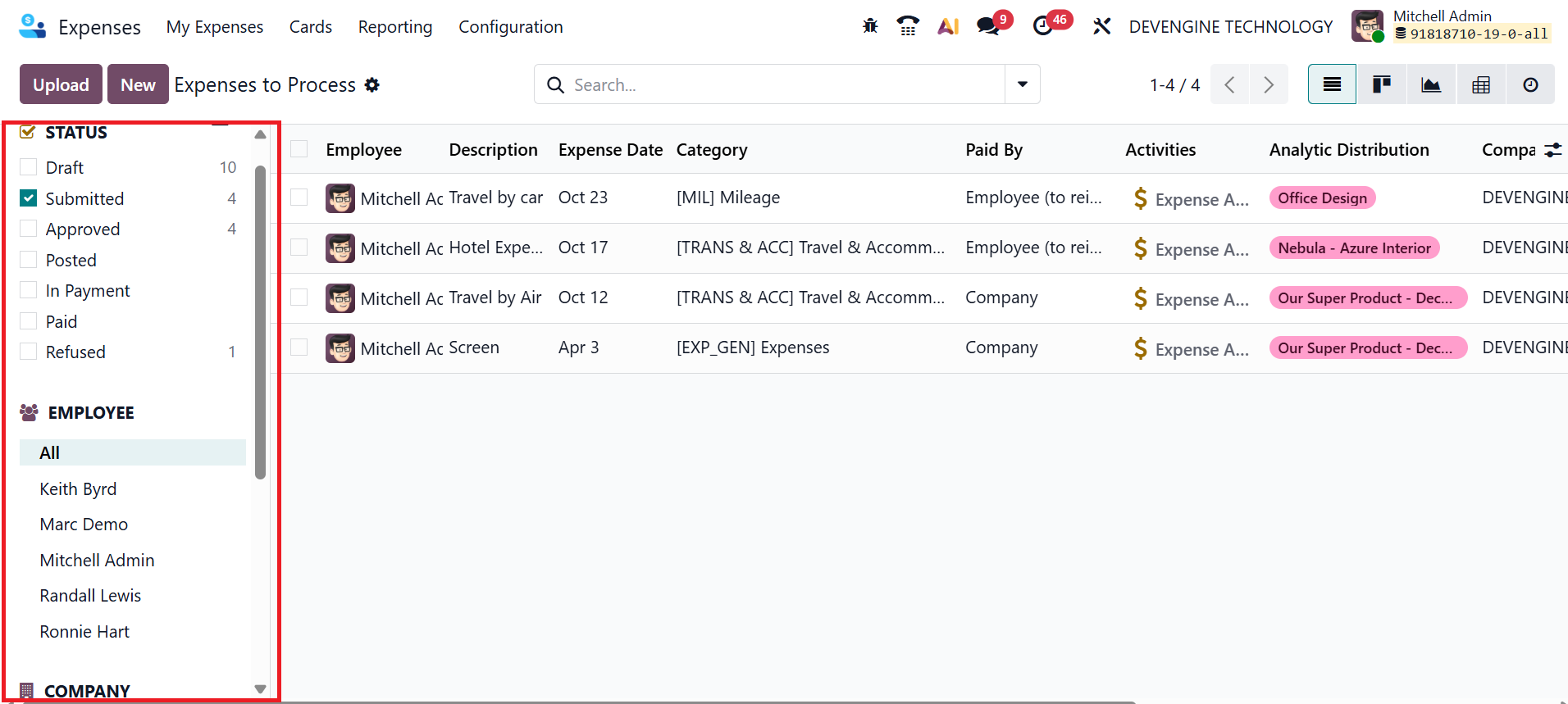 To sort the expense reports, select one of the three options on the left side of the screen: Status, Employee, or Company. The Status list helps for a quick filter to show expenses by stage. The Employee list shows the list of selected employees’ expenses. The Company list helps to filter the expense records by company.