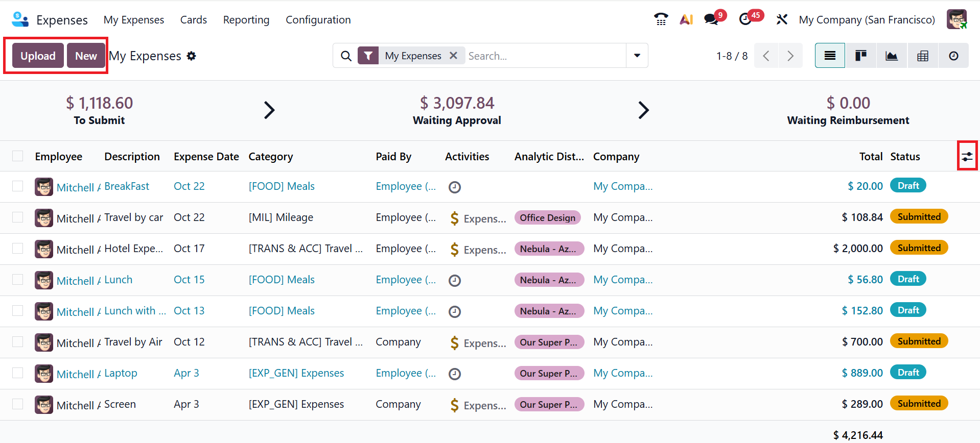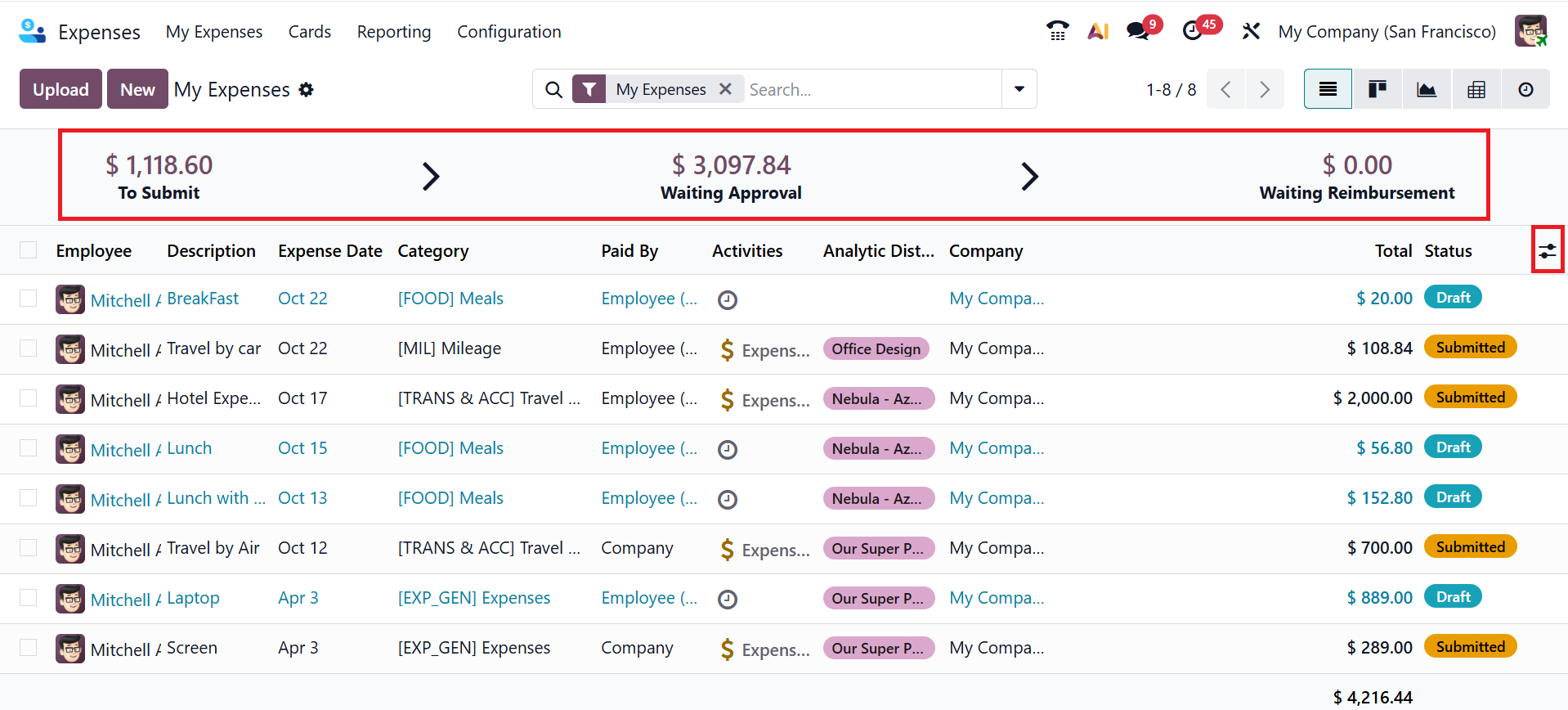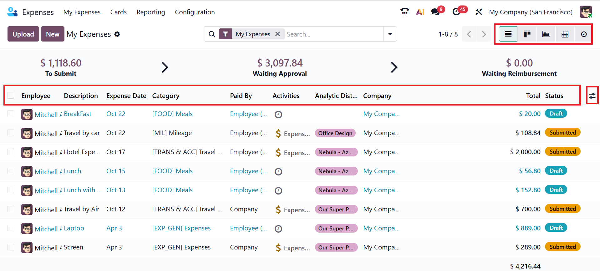 When you open the expense module, the My Expenses menu appears as the default dashboard view. There, you can see a list of expense reports' history, including the details such as Employee, Description, Expense Date, Category, Paid By, Activities, Analytic Distribution, Company, Total, Status, and you can add more details to the report by clicking on the toggle button in the right corner of the screen. By default, the My Expenses option is arranged in List view, and you can also change the view to Kanban, Pivot, Graph, and Activity.