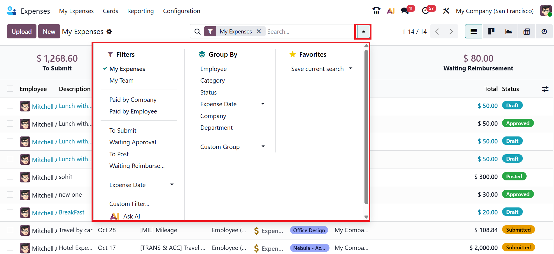 In the search bar, open the drop-down menu to reveal three options: Filters, Group By, and Favorites. You can filter the My Expenses menu based on the My Expenses, My Team, Paid by Company, Paid by Employee, To Submit, Waiting Approval, To Post, Waiting Reimbursement, Expense Date, and you can also use the Custom filter or Ask AI options. You can group the My Expenses menu by Employee, Category, Status, Expense Date, Company, Department, or use the Custom Group option. Under the Favorites option, you can save the filter for further use.