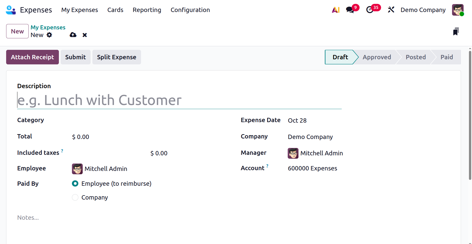 Add a concise description of the expenses in the Description field. In the Category field, add an expense category from the drop-down menu. Add the total cost of the expense in the Total field. In the Tax Included field, the tax percentage and amount will appear if taxes are configured for the expense category. Add an employee from the drop-down list in the Employee field. In the Paid By field, select either Employee (to reimburse) or Company based on the selected expense category.