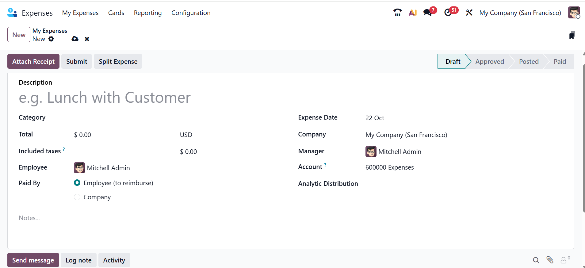 In the Expense Date field, select a date to incur the expenses. In the Account field, select an expense account to log the expense. Select a company from the drop-down to file the expense in the Company field. Select a company manager to manage expenses in the Manager field. In the Analytic Distribution field, select an account for which the expense should be written against from the drop-down menu for either Projects, Departments, or both. You can modify the percentage assigned to each analytic account, and use the Notes field to add details or comments about the expense for better clarity.