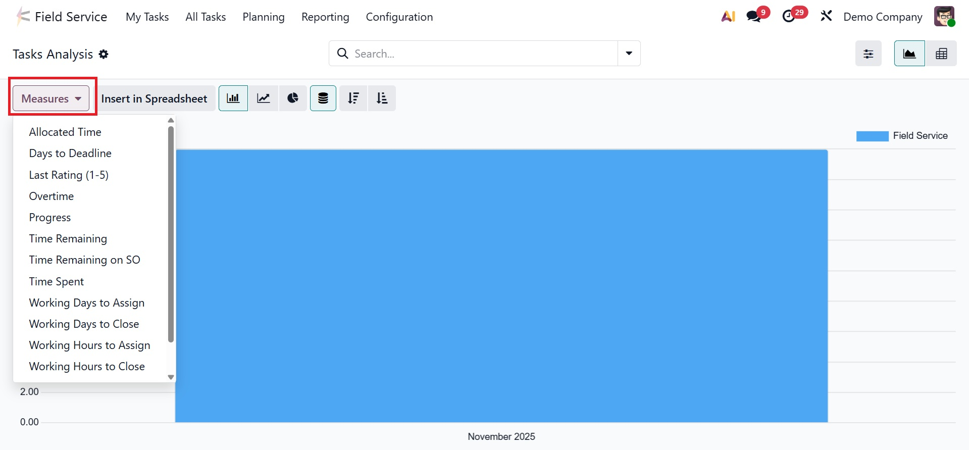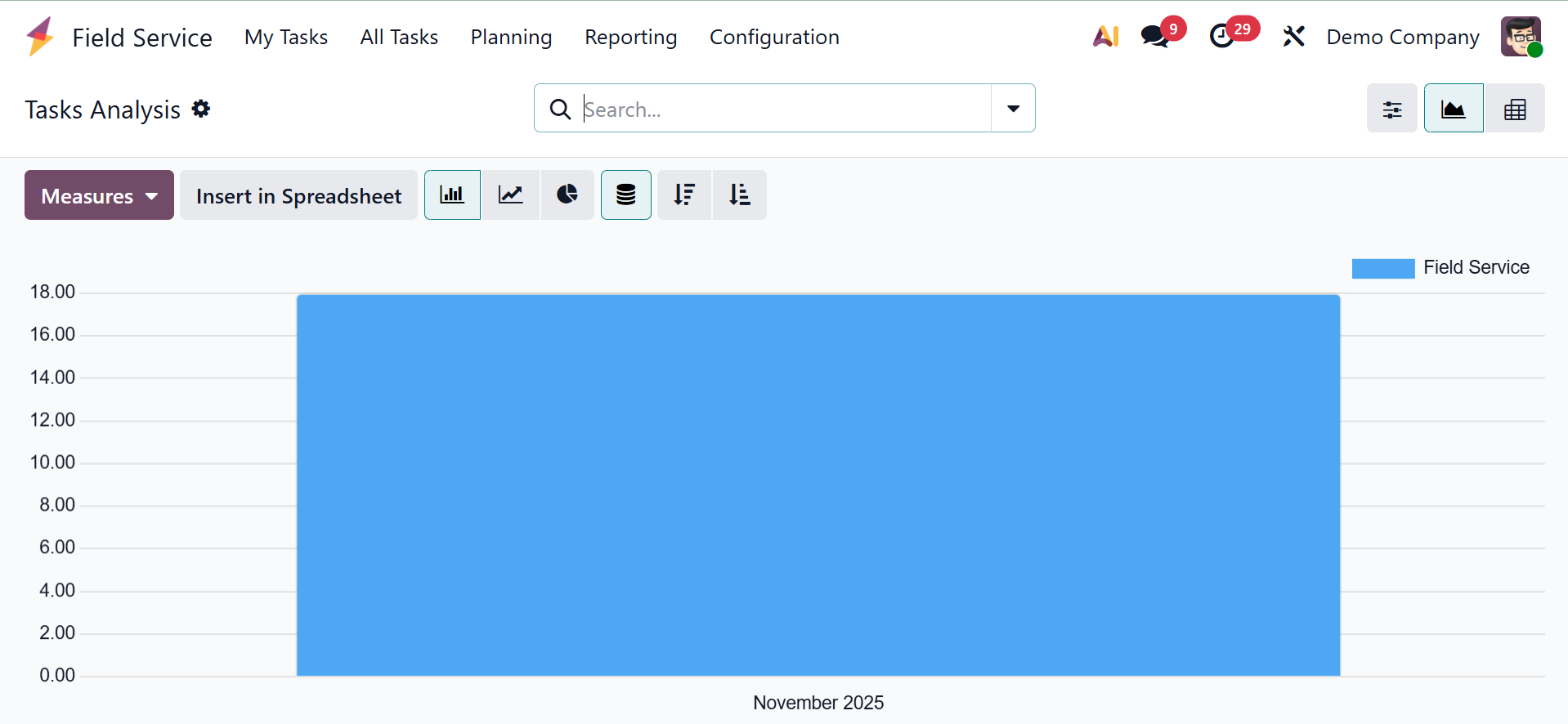 As seen in the screenshot below, the 'Tasks Analysis' reporting option in the Reporting menu of the Field Service module allows users to view the tasks that have been logged within the module graphically.