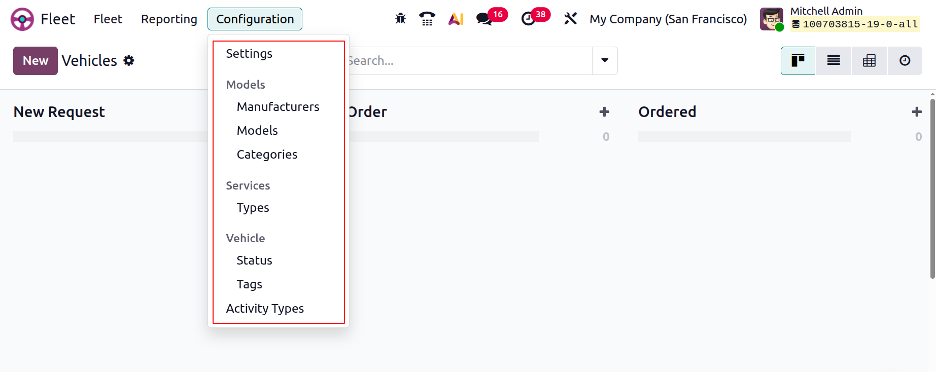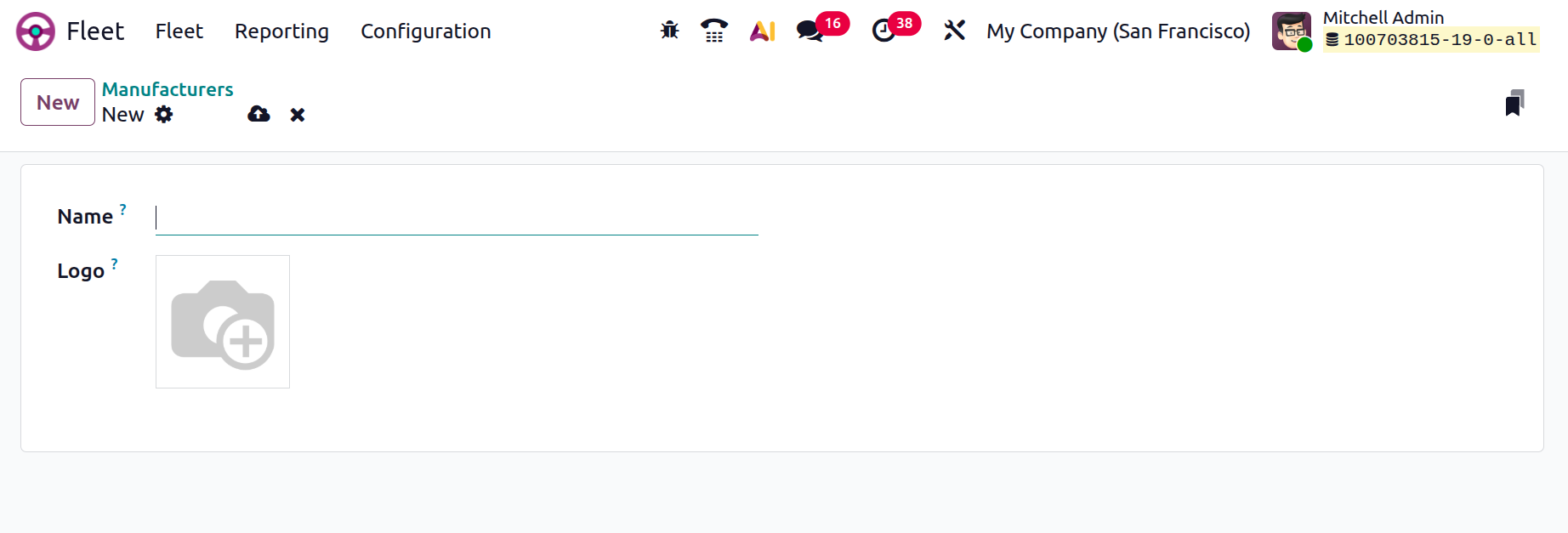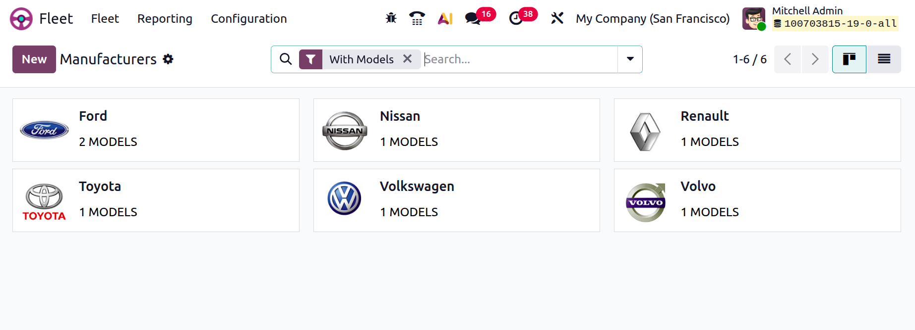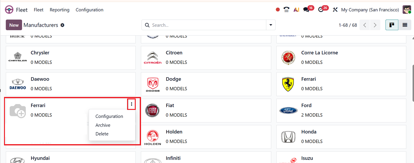 As soon as you save the new Manufacturer, it will be saved in your Fleet database and you can manage their models and other configurations directly from the Manufacturers dashboard using the Configuration option provided in the vertical menu of the kanban view, as shown in the screenshot below.
