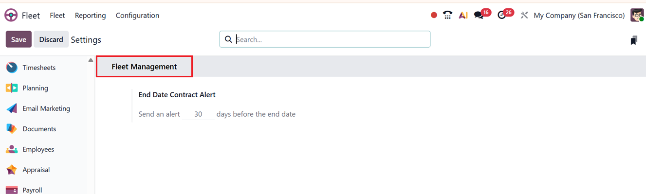 Within the Settings menu, users can enable the End Date Contract Alert feature in the Fleet Management tab section. This option sends automated notifications a specified number of days before a contract reaches its end date, helping prevent missed renewals.