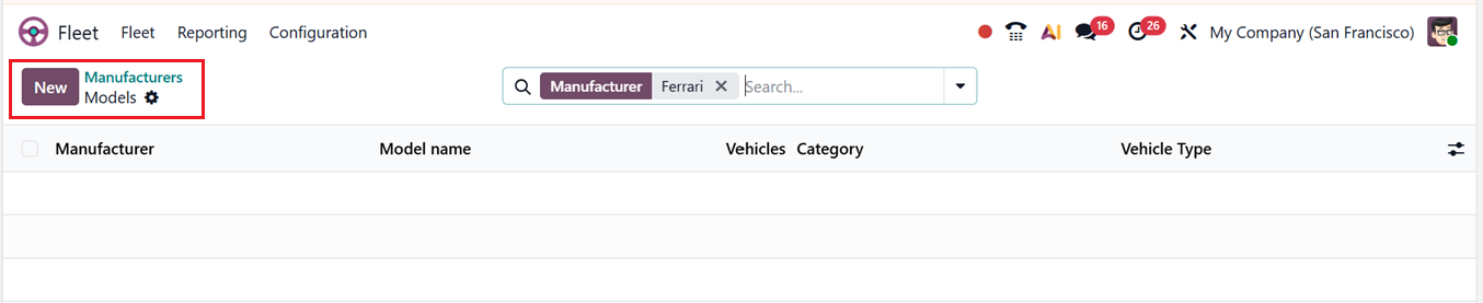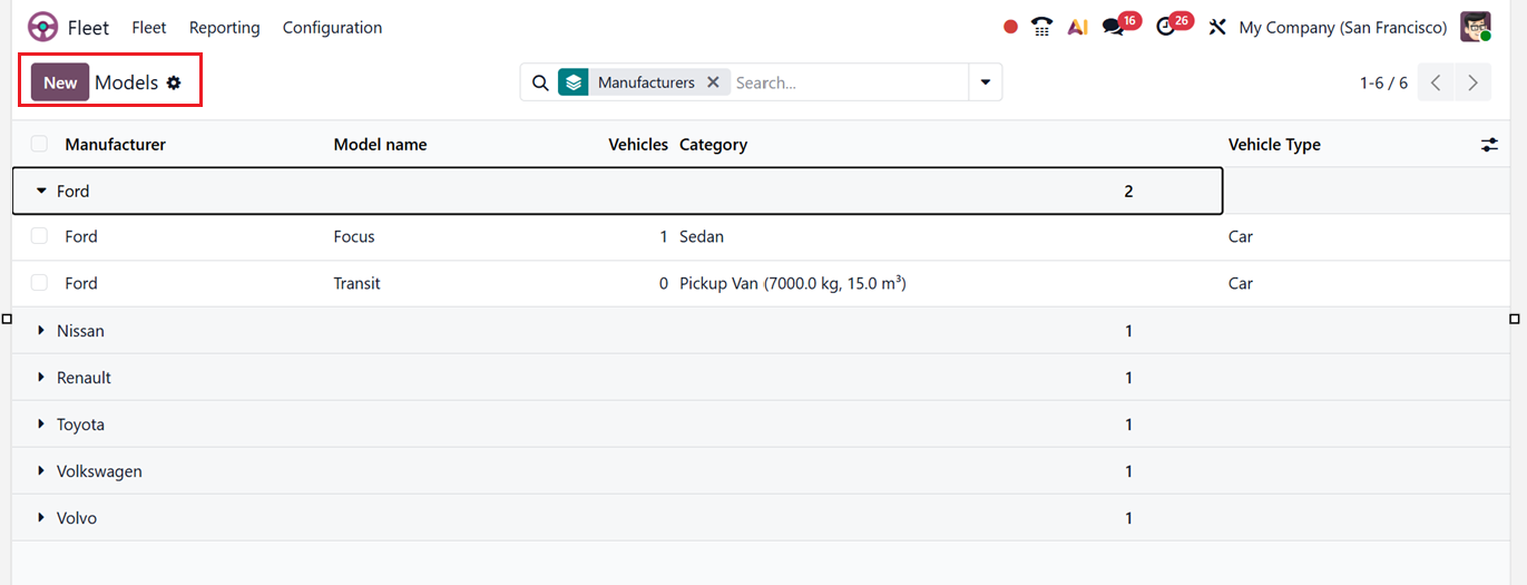 You can refine displayed data using filters, group-by options, and saved favorites. Creating a new model involves opening a configuration form and entering details such as Model name, Manufacturer, Vehicle Type, and Category, as shown in the screenshot below.