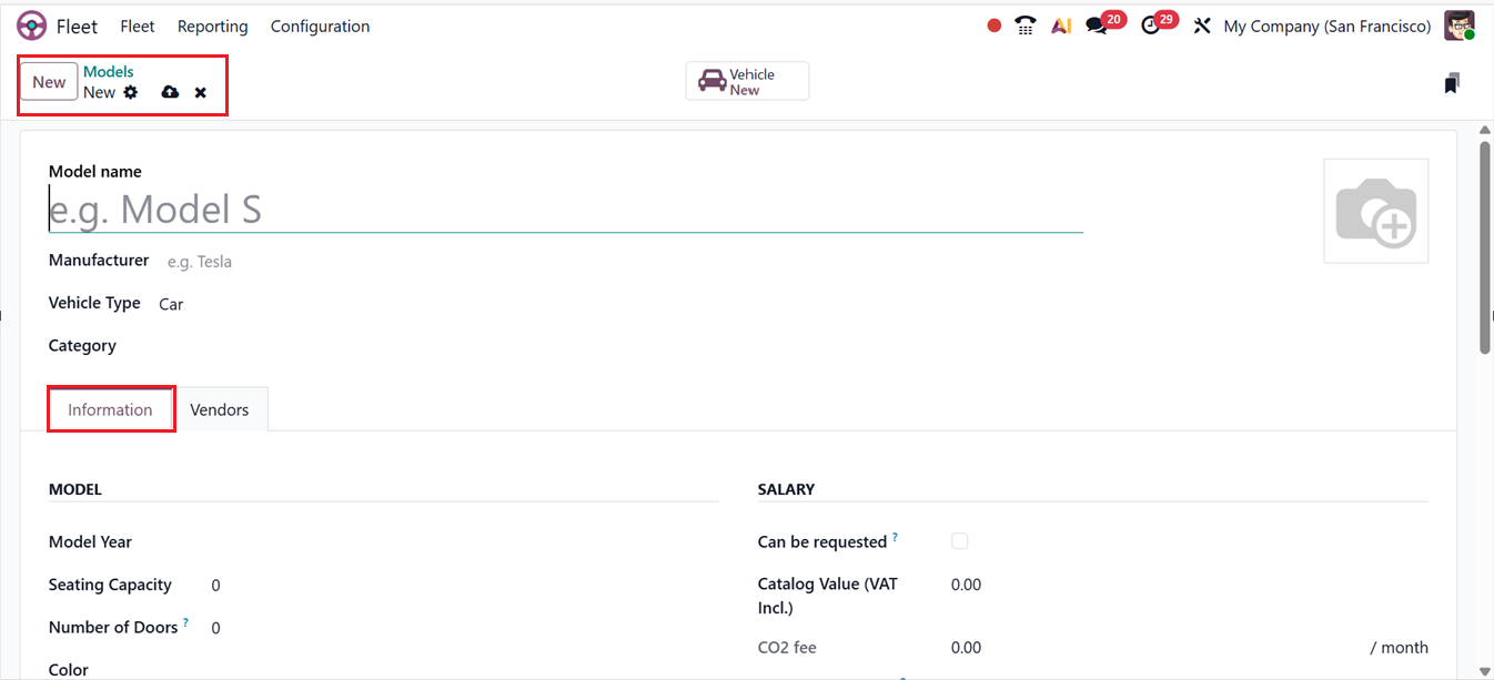 Then, you can see an extra form section named ‘SALARY’ in the ‘Information’ tab of the form, which appears only when the company’s localization is set to Belgium. Here, you can define various monthly cost values for this vehicle model, except for the Catalog Value (VAT Included), as shown in the screenshot below.