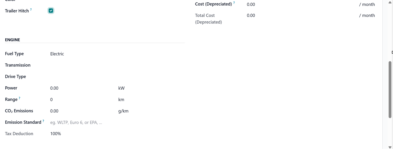 - The Cost (Depreciated) field records the monthly vehicle cost shown in the salary configurator, which affects the assigned employee’s gross and net salary and depreciates over time according to local tax laws, though depreciation occurs only through the linked vehicle contract rather than automatically on the model.
