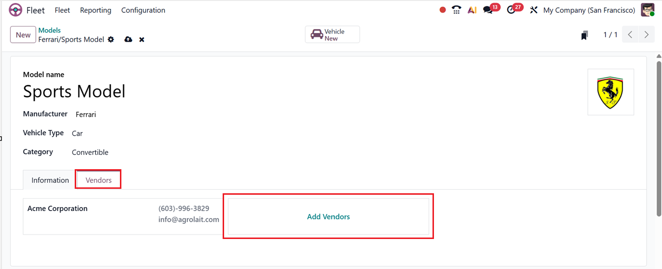 Then, the vendors supplying the model can be added under the Vendors tab using the ‘Add Vendors’ button, as shown in the screenshot below.