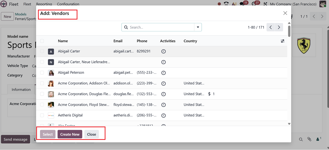 When you click on the Add Vendors button, Odoo will display the vendor list that has already been created. You can select an existing vendor from this list, or you can create a new vendor directly if it does not already exist in the system using the Inventory module if it is installed.