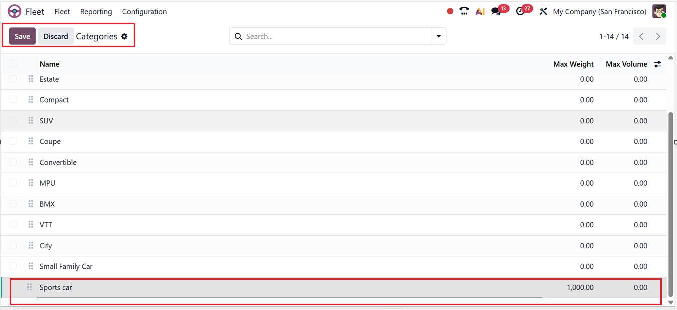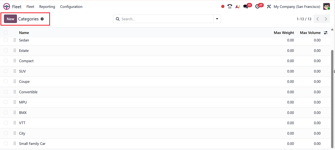 You can utilize the Categories feature from the Configuration menu to organize vehicles by classification. In the Categories dashboard, you can see existing categories displayed with details such as Name, Max Weight, and Max Volume details, as shown in the screenshot below.