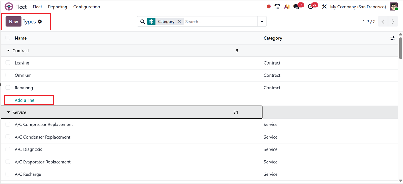 Then, you can create new types using the ‘Add a line’ button provided under the different category sections or using the ‘New’ button. Then, simply add the service type Name and relevant Category in the editing field.