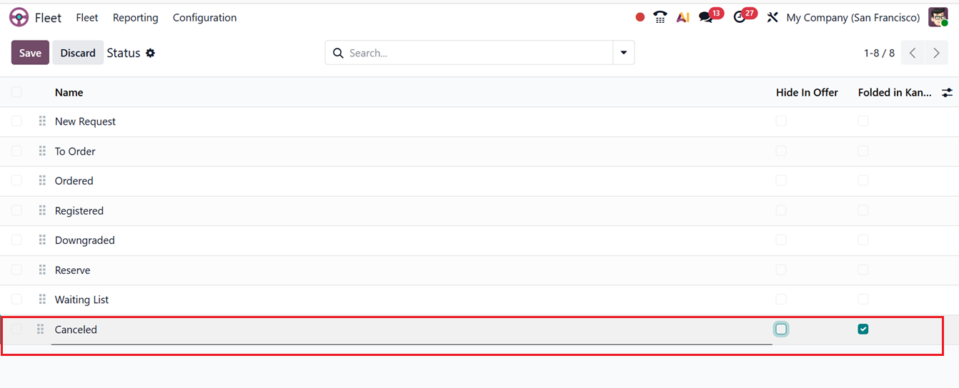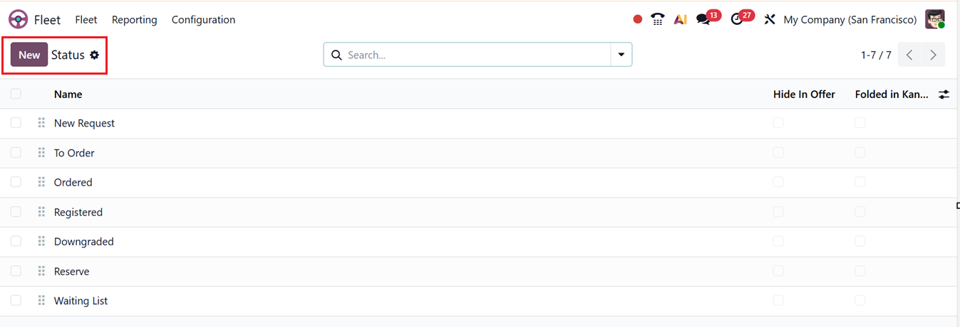 You can create new stages using the ‘New’ button and editing the Status Name. The Hide in Offer hides vehicles in that stage from offer or selection views, while Folded in Kanban collapses the stage by default to keep the Kanban view clean and focused. Finally, save the status.