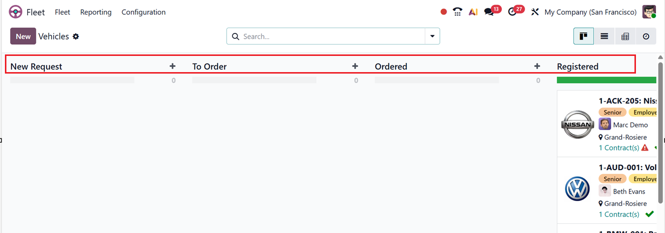These are the stages displayed when opening the Vehicles dashboard in the Fleet module. So, you can also create new stages using the ‘Add State’ button from the Vehicles dashboard