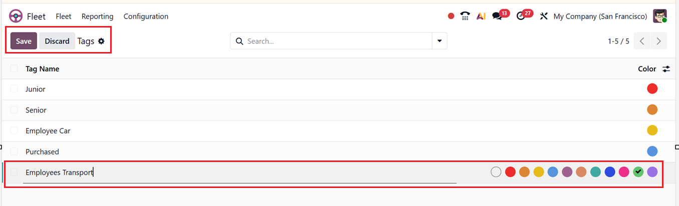 You can manage these vehicle tags using the Tags menu from the Configuration menu. You can see the available tags from the dashboard with their tag name and color. Then, you can create new tags by simply clicking on the New button and editing the Tag Name and choosing a highlight Color for the tag, as shown in the screenshot above.