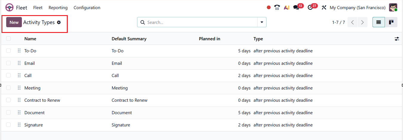 In Odoo 19 Fleet Module, these Activity types can be configured by navigating to the Configuration menu and selecting the Activity Types. This window displays a list of predefined activity types along with details such as their Name, Default Summary, Planned in durations, and Type.