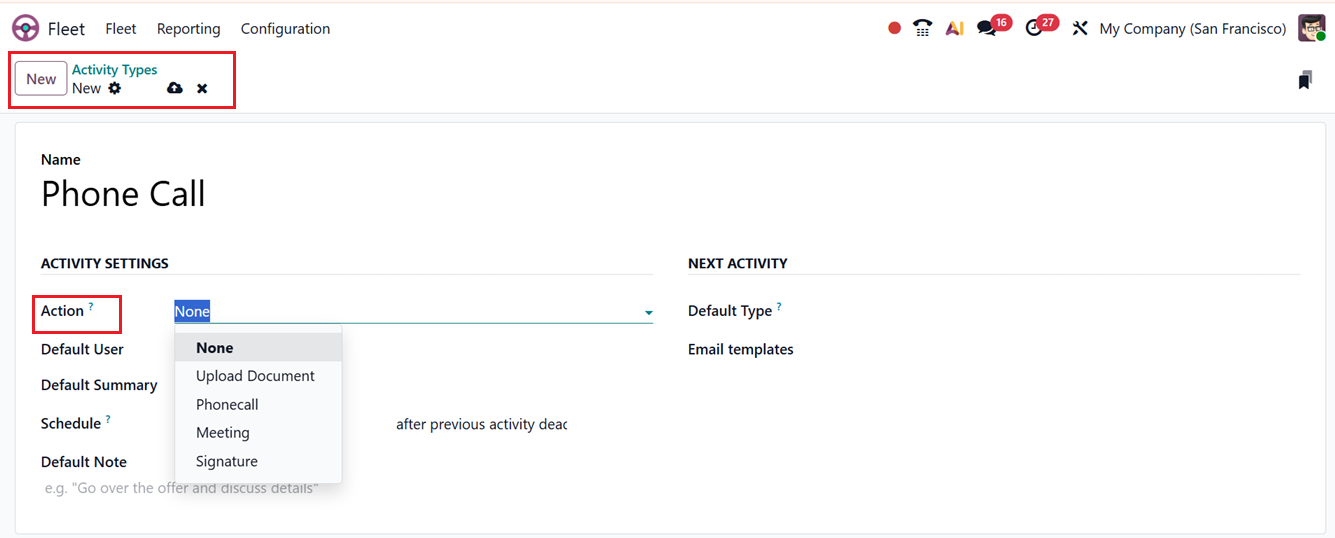 Odoo also supports automated task progression through the NEXT ACTIVITY settings. In the Default Type field, you can select an activity that Odoo will suggest once the current activity is marked as done. Additionally, Email Templates can be linked to activities to send predefined messages when tasks are planned, ensuring consistent and professional communication. After saving the activity type, you can utilize these while creating new vehicle services, contracts or any customer or employee interactions.